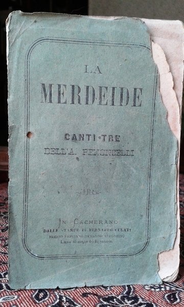 Volume in 12, brossura editoriale in carta azzurrina, titolo al piatto, frontespizio, 152 pp. comprensivo di due epitaffi. Raro libro dell'inizio del 1800, stampato da Gio. Grossi nel 1806, in forma anonima per quanto riguarda lautore e con falsi luoghi di stampa, se ne attribuisce la paternit all'abate Penoncelli dichiaratamente nelle edizioni successive. L'opera divisa in tre canti, in bella prosa, dal contenuto dissacrante o, piuttosto, grasso e ridanciano. Originali epitaffi a fine volume scritti da Solimano all'autore della merdeide e dall'autore al sedicente Solimano. Legatura lenta, mende e mancanze alla brossura, in particolare allangolo superiore della brossura anteriore e del frontespizio (molto marginale e senza perdita di testo). Originale e tagliente, rara e gustosa canzone scatologica, assai poco comune.