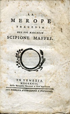 In-8°, pp. 112, brossura editoriale. Vignetta con l'ouroboros al titolo. Fioriture e aloni sparsi. Discreta copia in barbe. La celebre tragedia del Maffei venne rappresentata nel 1713 e pubblicata l'anno successivo. Essa conobbe immensa fortuna, venendo rapidamente imitata da autori come Voltaire e Alfieri, da cui derivarono poi, nel XIX secolo, le opere drammatiche o poetiche di Almeida Garrett e di Matthew Arnold.