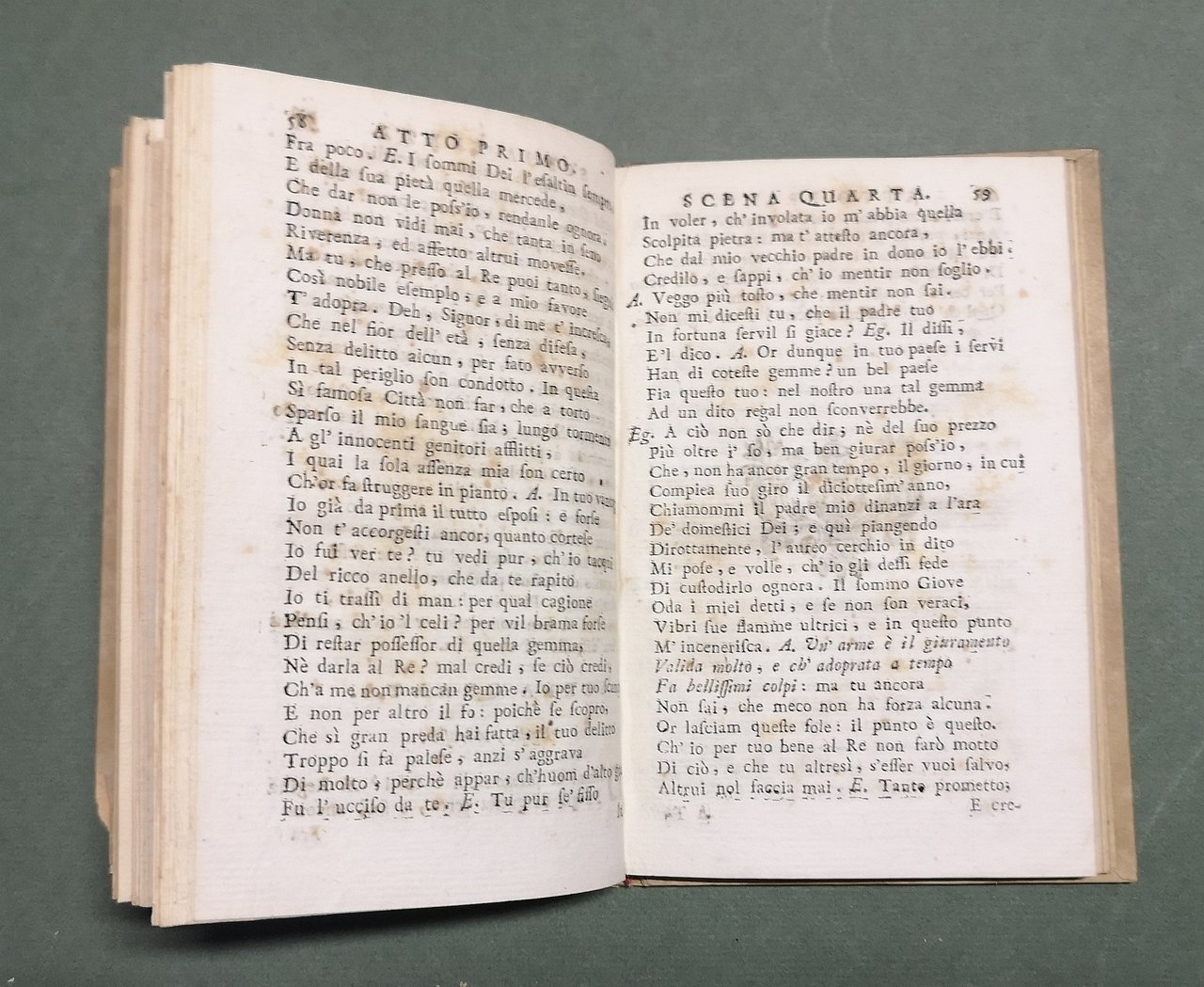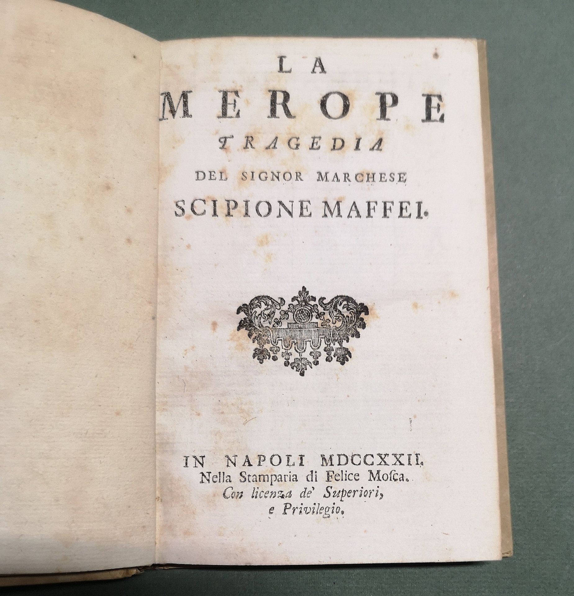 >in-8, pp. 141, (3), leg. mod. cart. rigido. Dedica dell'autore a Rinaldo I, duca di Modena, preceduta dal lungo ''Ragionamento sopra la Merope'' di Padre. Sebastiano Paoli di Lucca (sotto lo pseudonimo arcade di Tedalgo), indirizzato a Clelia Cavalcanti Sambiasi ''Principessa di Campana''. Pregevole edizione. Buon esemplare (con lievi bruniture). Manca a Soleinne e Rasi. Bertana 242. Cat. 141, Olschki, 267.
