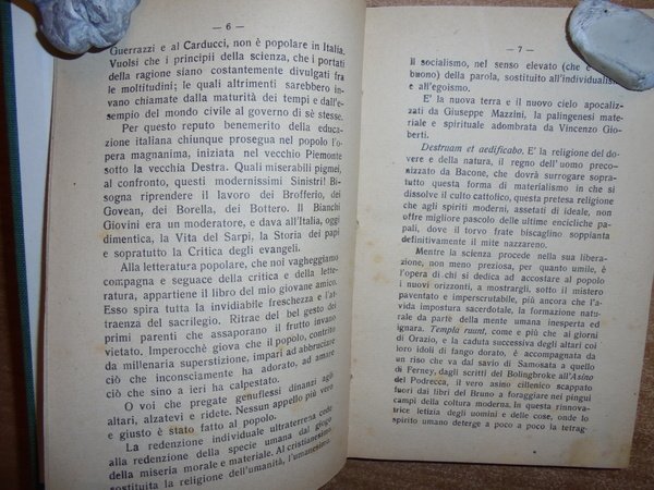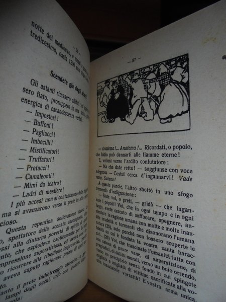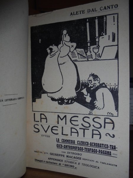 Alete Dal Canto. Senza Editore, senza data ma primi 900'. La Messa svelata ovvero La commedia clerico-acrobatico-tragico-antropofago-teofago-pagana con Introibo dell On. Avv. Giuseppe Macaggi deputato al parlamento. In-16°, tela con titolo in oro entro tassello al dorso. 125 pp. con disegni e caricature di Bruno nel testo. Ottimo esemplare. Neg. mob. 100