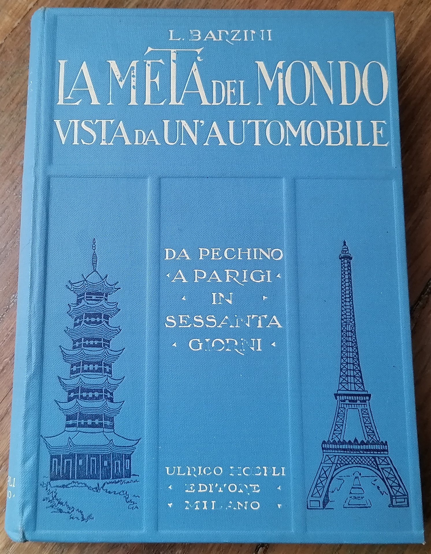 In 8°, legatura editoriale in piena tela blu con titoli impressi in bianco, al piatto anteriore entro compartimenti in rilievo due impressioni in nero : una pagoda cinese e la Tour Eiffel, guardie in carta editoriale, all'interno la consueta copertina in cartoncino con titoli in verde e rosso ed immagine fotografica virata in seppia con bandiera italiana a colori, pp. XXIX,(3),523,(1), con 126 illustrazioni originali nel testo, 13 tavole virate in azzurro fuori testo ed in fine una carta itineraria più volte ripiegata. Sesta edizione con diversa legatura dell'editore rispetto a quelle realizzate per le precedenti pubblicazioni. Volume in ottimo stato di conservazione, solo alcune lettere dei titoli impressi in bianco presentano piccole e parziali perdite di colore.