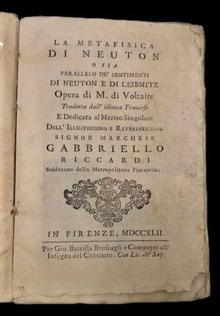 La Metafisica di Neuton o sia parallelo de' sentimenti di Neuton e di Leibnitz. Opera di M. di Voltaire tradotta dall'idioma francese e dedicata al merito singolare dell'illustrissimo e reverendissimo signor marchese Gabbriello Riccardi Suddecano