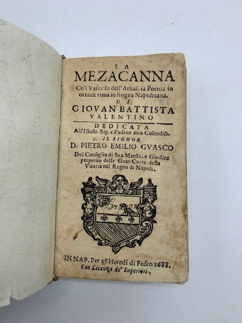 In 24 (cm 8 x 14), pp. (12) + 180. Legatura coeva in piena pergamena con alcuni restauri, sguardie rinnovate. Pagine uniformemente brunire, qualche leggera gora agli angoli dei fogli (con mancanze reintegrate ai margini di due o tre fogli). Edizione del 1688 di questo poema in ottava rima in dialetto napoletano di intento moraleggiante. L'A., dopo la pestilenza del 1656, si scaglia contro gli eccessi del lusso smodato. L'edizione originale, del 1669, fu stampata da Luc'Antonio di Fusco e comprendeva il frontespizio figurato e un ritratto dell'autore. Una seconda edizione comparve nel 1688, 'per gl'heredi di Fusco', stampata con il sostegno di Francesco Massari, con l'aggiunta di una tavola calcografica con una sequenza sinottica di quanto raccontano le ottave del componimento. Esiste poi un'altra variante del 1688, stampata sempre per gli eredi Fusco, ma ad istanza di Domenico Antonio Parrino. Questa nostra edizione del 1688 riporta solo una piccola vignetta al frontespizio e l'indicazione di stampa 'Per gl'heredi di Fusco' senza ulteriori specifiche e non presenta tavole. Seguirono varie altre edizioni.