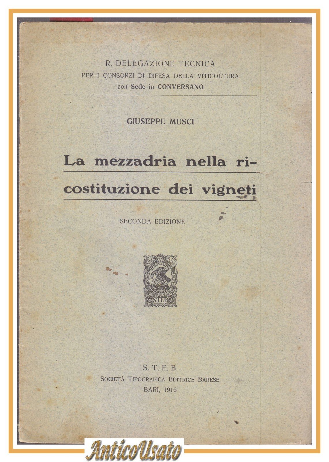 LA MEZZADRIA NELLA RICOSTITUZIONE DEI VIGNETI di Giuseppe Musci. S. T. E. B. Società Tipografica Editrice Barese Bari II edizione, 1916.