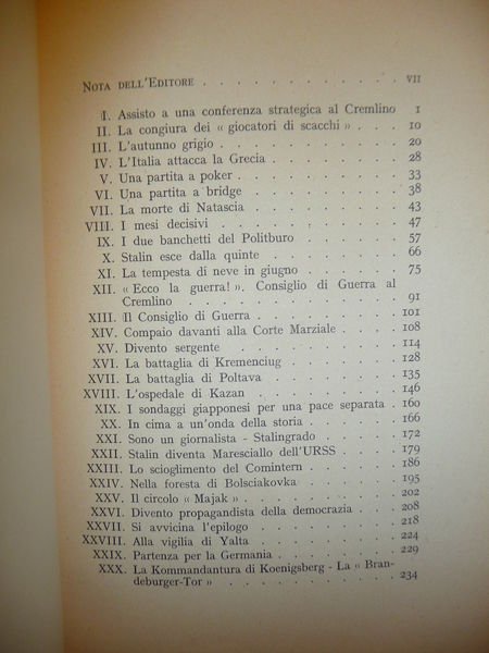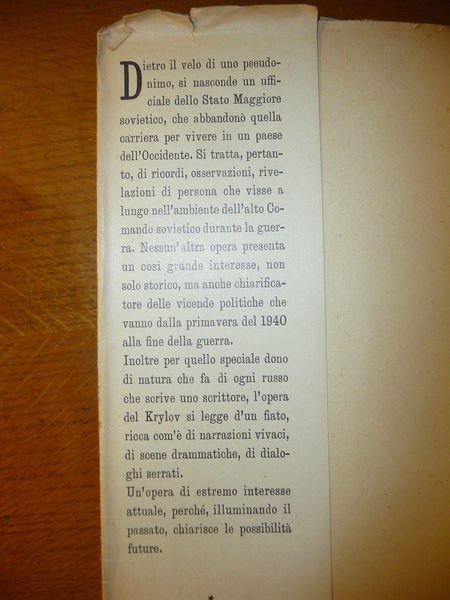 DESCRIZIONE: Rizzoli Editore Milano 1950 I^ Ed., br. ed. con sovracc. ill., pp. 241. Le esperienze dell'autore nell'Armata Rossa prima e durante la II Guerra Mondiale. L'A., gia' ufficiale di S.M. Sovietico rievoca, sotto pseudonimo, i retroscena che portarono all'alleanza russo-tedesca, gli avvenimenti bellici con particolare riferimento alla battaglia di Stalingrado, l'insediamento dei Russi a Berlino, i convegni di Teheran e Yalta, ecc. Indice completo in foto. CONDIZIONI: Buone, sovracc. con piccole mende, ma peraltro rara da trovarsi in questa collana. PESO / WEIGHT: 301 gr. without package