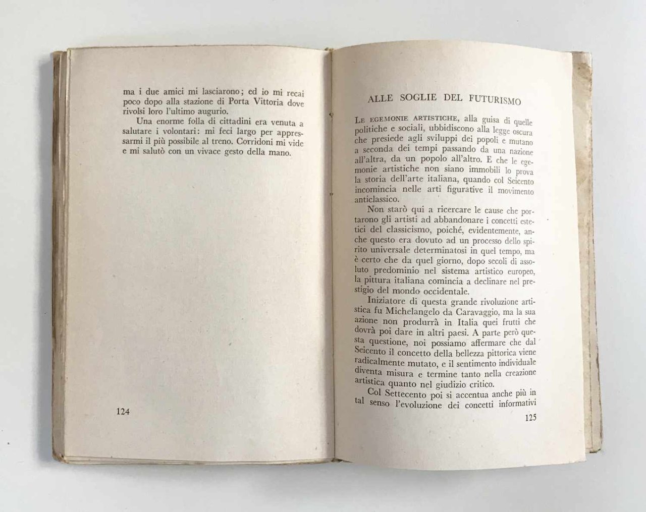 LIBROEdizione originale.Ottimo esemplare.Libro estremamente raro: «[.] quasi l'intera tiratura andò bruciata durante un bombardamento» (Cammarota). Fondamentale raccolta di memorie di Carrà, piena di notizie sull’ambiente artistico italiano del primo Novecento — che l’artista aveva attraversato in quasi la sua totale estensione, dal liberty al novecentismo, passando per il futurismo.Cammarota, Futurismo, 88.4 (collazione con imprecisioni)