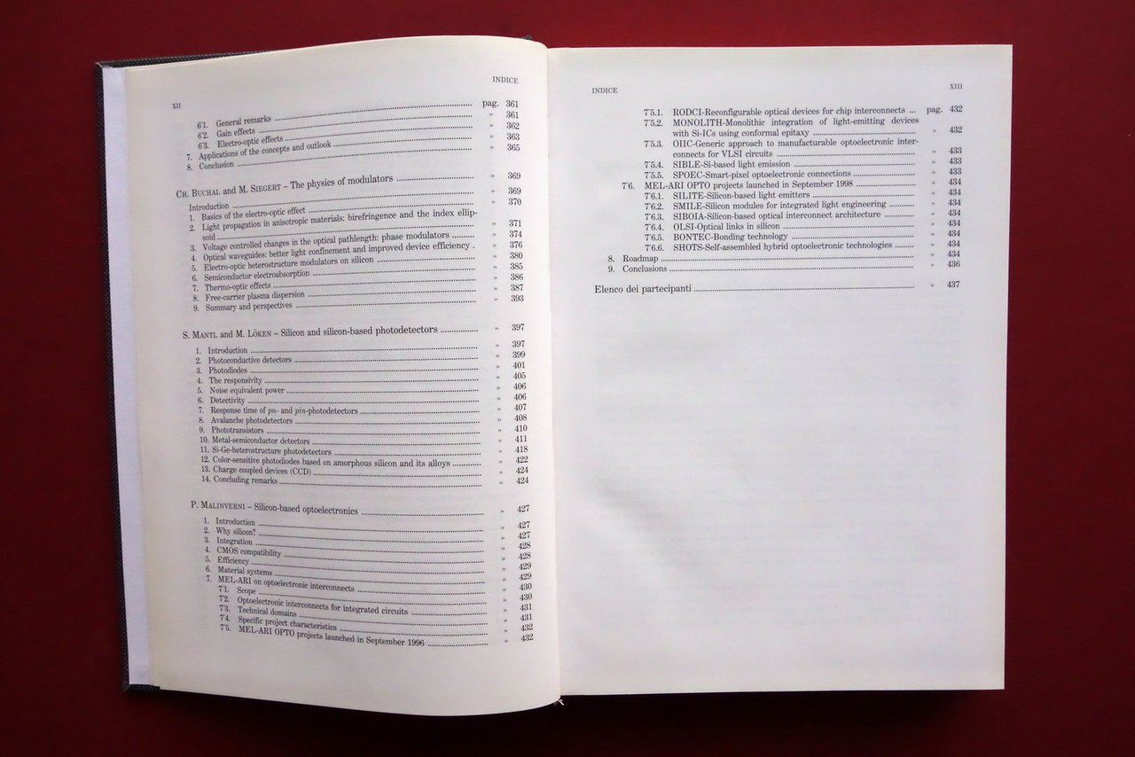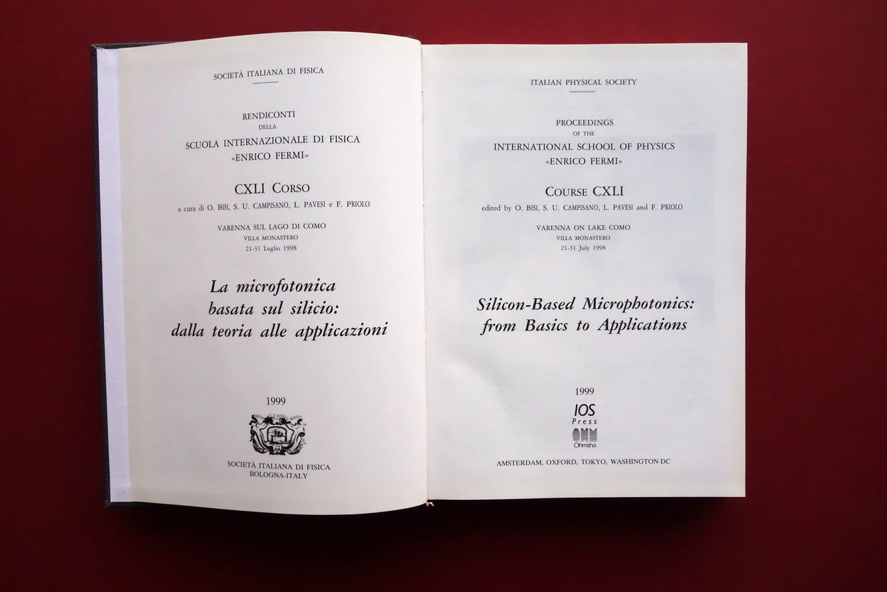 AA. VV., Società Italiana di Fisica - rendiconti della Scuola Internazionale di Fisica Enrico Fermi" CXLI Corso a cura di O. Bisi, S. U. Campisano, L. Pavesi e F. Priolo Varenna sul Lago di Como - Villa Monastero 21 - 31 luglio 1998 "La microfotonica basata sul silicio: dalla teoria alle applicazioni" Società Italiana di Fisica - IOS Press, 1999; cm 24,5x17; pp. XX-452 con numerose fig. in b/n; tutto cartonato ed. telato con titolo impresso in oro al dorso e al piatto ant. Edizione in lingua inglese. Condizioni di conservazione Ottime condizioni, poco sfogliato. Interni ottimi, freschi. Per maggiori dettagli sugli interventi e gli studiosi / accademici partecipanti vedi foto indice. Edizione in lingua inglese. SETT183.L26963 N "