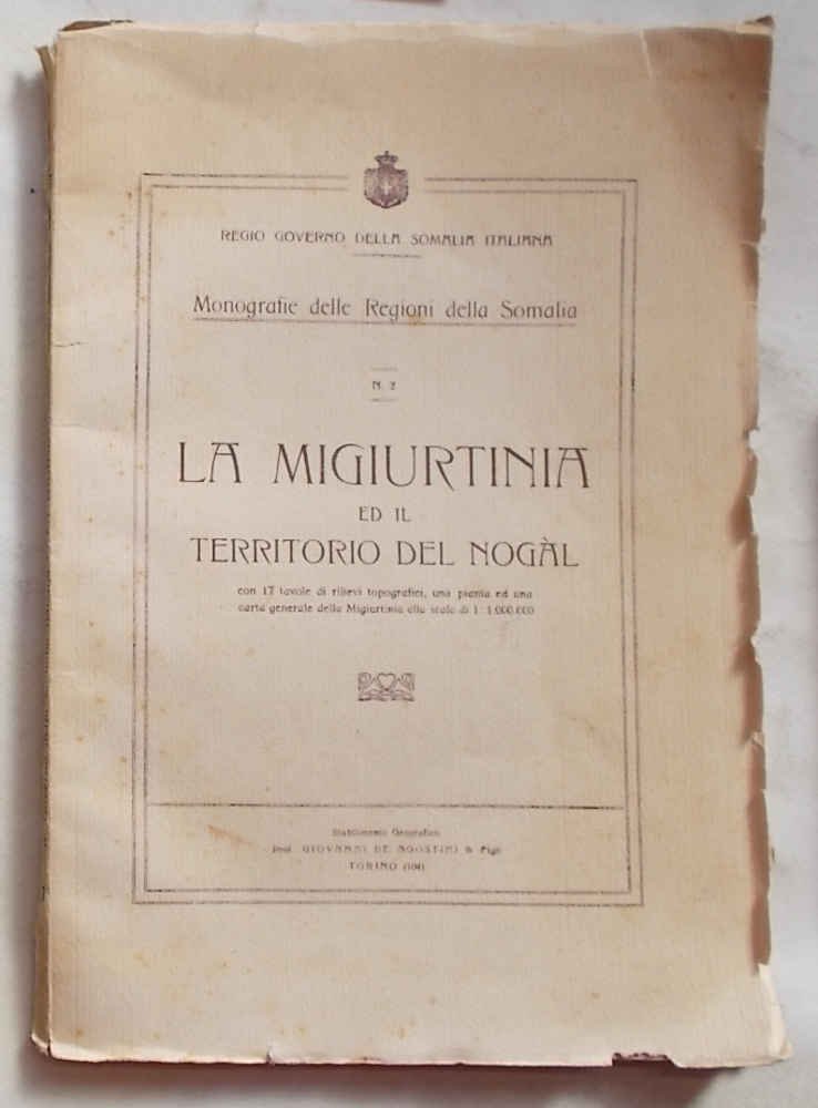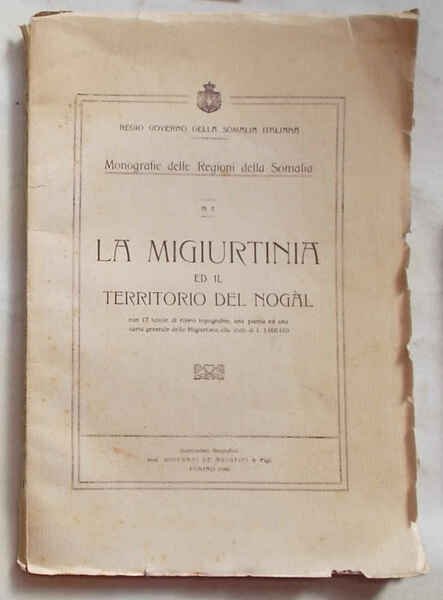 In 4° (cm. 32 x 22); pagg. 65; con 1 grande carta geografica in scala 1:1.000.000 più volte ripiegata f.t., 1 pianta a colori, 17 carte a colori -anche ripiegate- f.t. e 3 alberi genealogici n.t.; leggera cartonatura originale. VG. ** Regio Governo della Somalia Italiana - Monografie delle Regioni della Somalia n. 2. Contiene: descrizione del territorio, le popolazioni del Sultanato, agricoltura - pastorizia - industria, il commercio e il traffico marittimo, la fauna, la flora, notizie meteorologiche, notizie e dati di carattere militare, rilievi di itinerari e determinazioni astronomiche del Sultanato, l'Italia nel Sultanato dei Migiurtini, tabelle genealogiche.