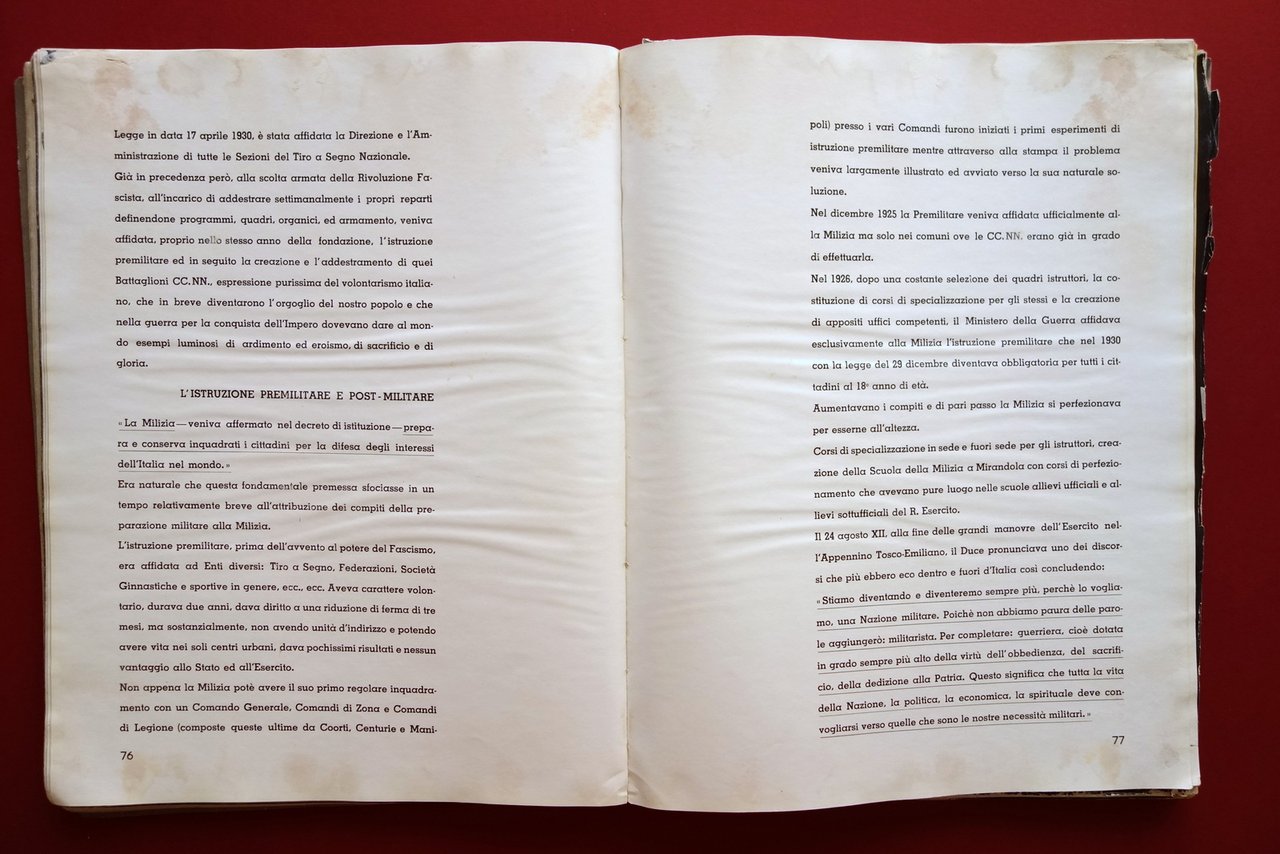 † La Milizia Universitaria ai goliardi del mondo 1938 - a cura dell'Ispettorato Generale Reparti Universitari M.V.S.N. Italica Editoriale, Milano 1938, cm 36,5x28, pp. 242 con numerosissime ill. fot. in b/n e alcune tavv. a col. nel t., a piena pagina e su due pagine (qualche tavola Ë stata realizzata su cartoncino); brossura ed. illustrata in bianco e nero. Condizioni di conservazione Volume in discrete condizioni con tracce d'uso, minime / lievi ondulazioni e leggere tracce di vecchia umidit‡ prevalentemente ai margini (vedi foto); margini e angoli dei piatti con qualche piccola mancanza e minuscole abrasioni; parte inferiore del dorso fessurato con mancanza di alcuni cm (vedi foto), esemplare complessivamente compatto seppur delicato, con qualche pagina staccata dal corpo del testo (vedi foto). Curata e notevole pubblicazione del ventennio, di taglio nettamente propagandistico, corredata da numerosissime illustrazioni fotografiche e tavole in bianco e nero e a colori nel testo, a piena pagina e su due pagine. Si passano in rassegna i maggiori episodi storici e gli eventi che hanno contraddistinto l'Italia dal 1922 al 1938, con riferimenti anche agli anni della Grande Guerra e a quelli immediatamente successivi. In condizioni come da foto e da descrizione. † SETT205.L19286 N