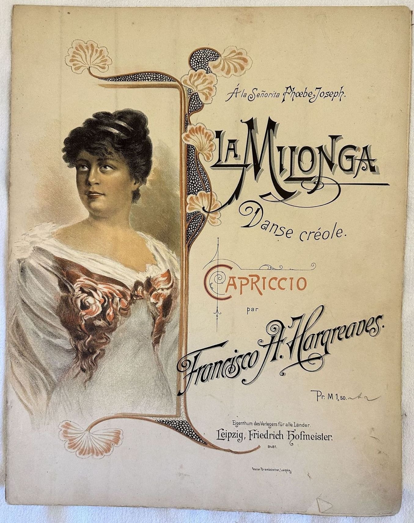Edizione di inizio novecento della melodia "La milonga" di Francisco H. Hargreaves (1849-1900). Bella illustrazione in copertina. In buone condizioni. Copertina editoriale in buone condizioni con lievi usure marginali. Piatti in parte staccati. Legatura editorialmente assente. Pagine in ottime condizioni con rare fioriture. In folio. cm. 34,5x27. Pp. 9.Edtion of early 20th century of the melody "La milonga" by Francisco H. Hargreaves (1849-1900). Beautiful illustration in the cover. In good conditions Editorial cover in good conditions lightly worn in the extremities. Plates are partially detached. Binding is editoriarly missing. Pages in very good conditions with occasional foxing. In folio. cm. 34,5x27. Pp. 9.