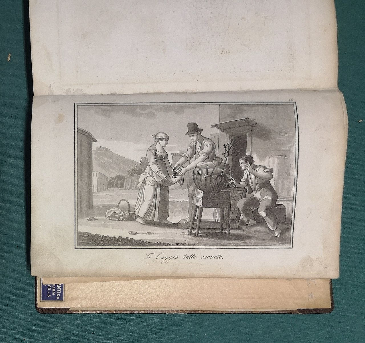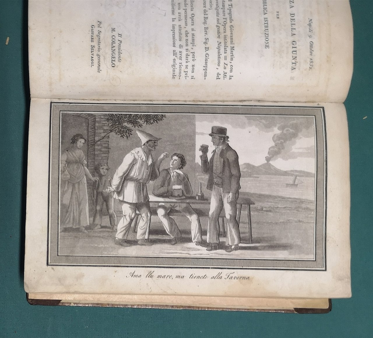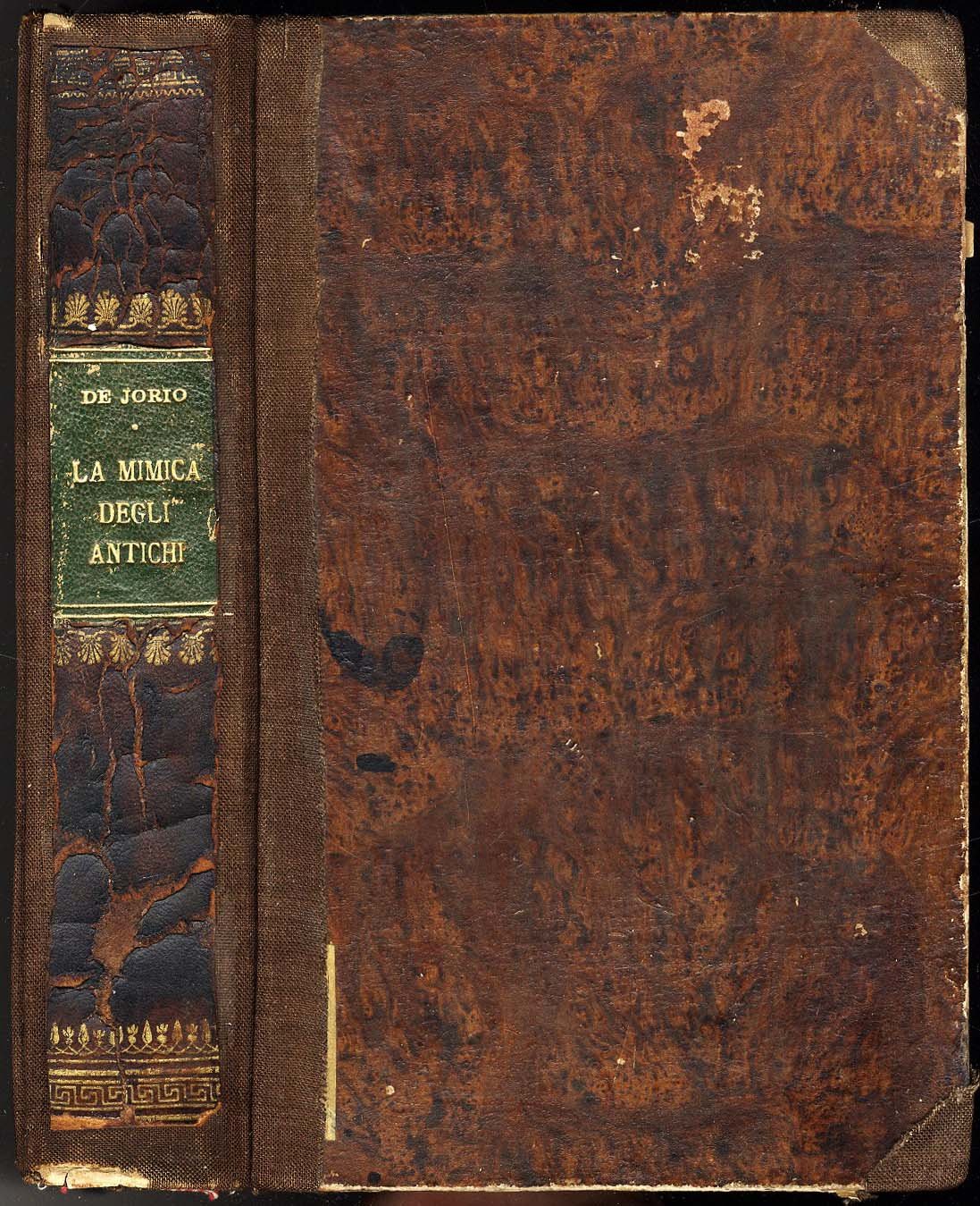 >in-8, pp.(2), XXXVI, 380, (4), legatura lievemente posteriore in mezza tela e angoli, con al dorso applicata porzione di leg. coeva in pelle, con titolo oro su tassello verde. Dedicato dall'a. a S.A. Reale Federico Guglielmo principe ereditario di Prussia. Corredato in fine di 20 interessantissime tavole in rame f.t. (su 21 totali; purtroppo mancante la tavola 19): le prime 16 sono opera del grande artista Gaetano Gigante (vedi nota in calce a pag. VII) ed incise all'acquatinta da le Baron de Clugny de Nuis, ''série de Bambocciate, en nombre de 16, à la manière de lavis'' (come si legge nell'avviso al lettore al verso del titolo); raffigurano scene popolari di straordinario interesse per la conoscenza della mimica e della gestualità così istintiva e familiare nella comunicazione verbale dei Napoletani; le altre 5 tavole sono al tratto e raffigurano gesti di personaggi dell'antica Grecia, la varia posizione delle dita nell'indicazione di numeri e di particolari messaggi espressivi. Prima edizione, ed unica, di questo studio approfondito, pregiato ed unico in materia, di notevole interesse anche per le affinità con la gestualità dell'arte drammatica (già molto apprezzato dal noto giornalista-scrittore Luigi Barzini in un'ampia recensione apparsa sul ''Corriere della Sera'' del 15 luglio 1958). Il canonico napoletano A. De Jorio fu profondo conoscitore di archeologia e storia patria ed autore, oltre il presente, di numerosi studi e guide, specialmente concernenti Pozzuoli, ove trascorse buona parte della sua vita. Esemplare ben conservato, tracce di polvere al titolo e nel margine bianco di qualche tavola, qualche macchietta rossa (una di ca 3 cm per 2 nel margine bianco delle pp. 368-380). Manca al Fera-Morlicchio e alle bibliografie e cataloghi consultati.