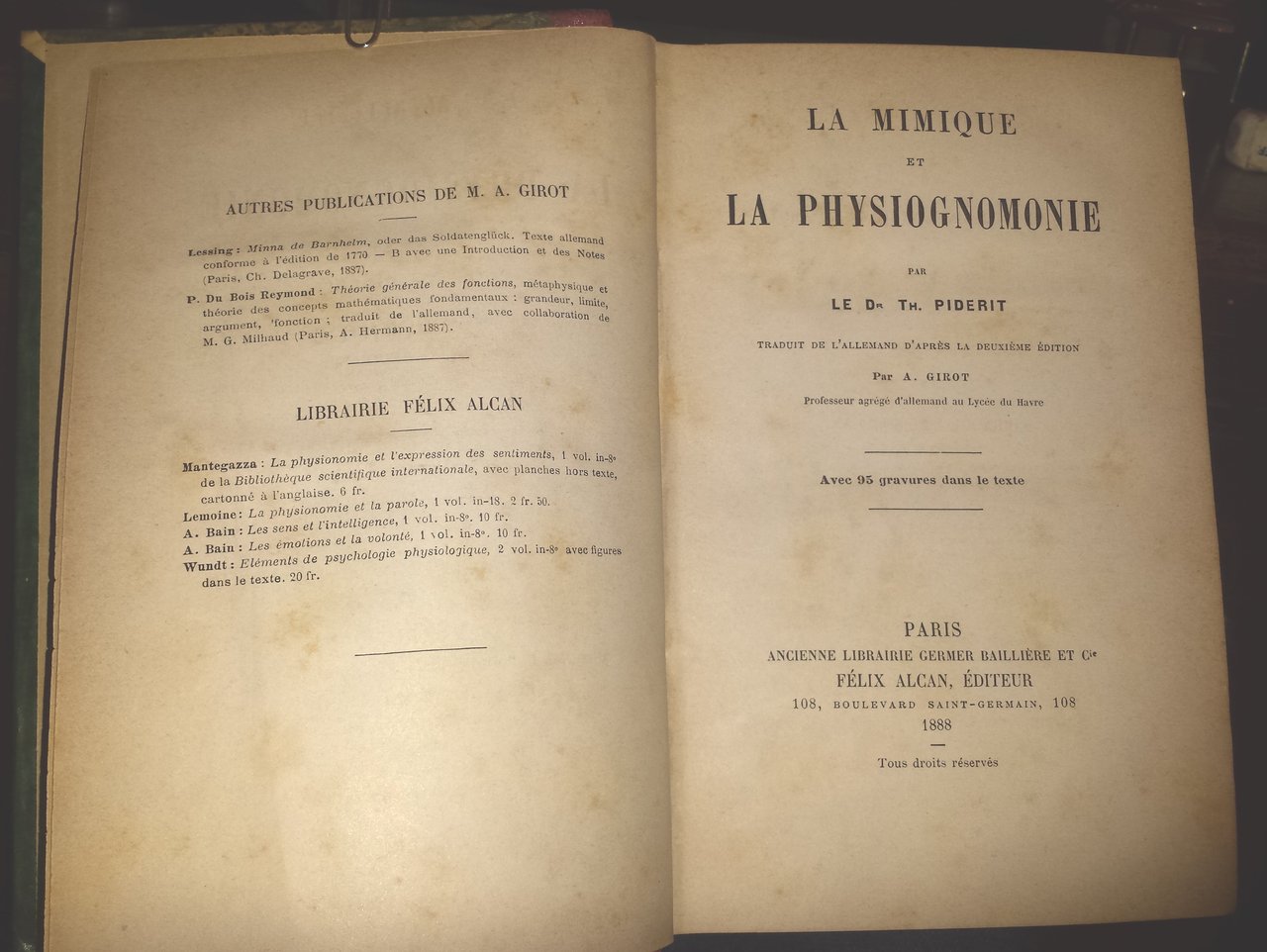 La mimique et la physiognomonie par le Dr. Th. Piderit; traduit de l'allemand d'après la deuxième édition par A. Girot, professeur agrige d'allemand au Lycee du Bavre. Avec 95 gravures dans le texte