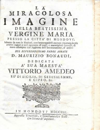 in 4° (cm 19,6x14), pp.2 b., 20 nn., 406, 2 b., leg. coeva in p/pergamena, ds. a nervi con tit. in oro su tass., fregio al front., numerosi capil. e finalini, di cui 1 più grande con la Madonna e il Bambino. "Co'l racconto di novi, e maravigliosi successi, di nuovo ristampata col'aggionta dell'Incoronazione, d'ordine del Reverendissimo Padre Abbate D. Maurizio Bonaudi dedicata a' sua Maestà Vittorio Amedeo re di Sicilia, di Gerusalemme, e Cipro". Esemplare fresco con carta forte, piccolo danno alla cerniera ant. Molto raro. SPEL-003