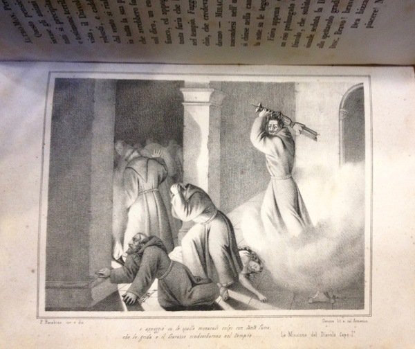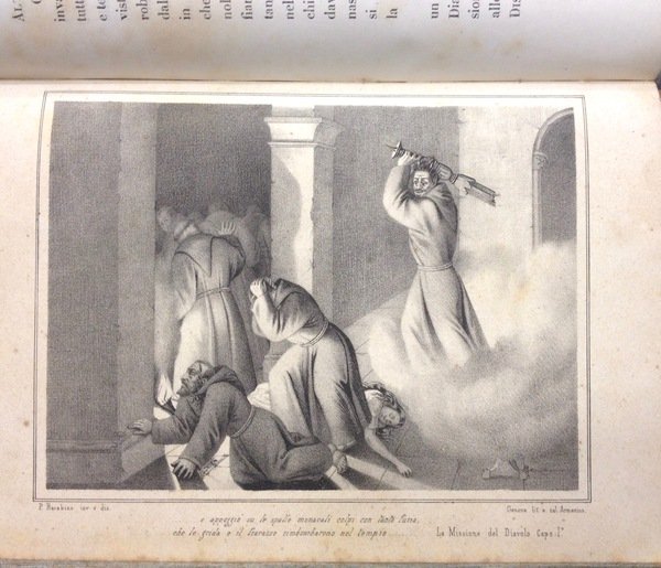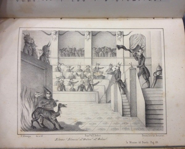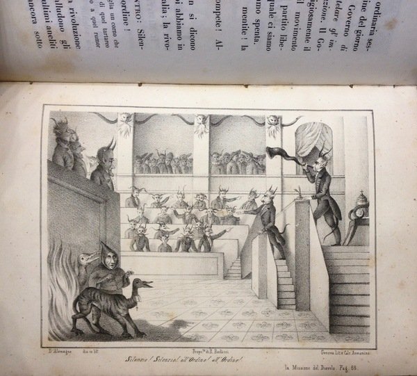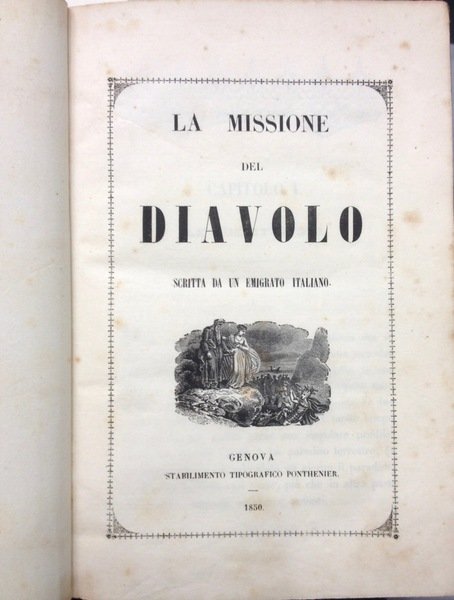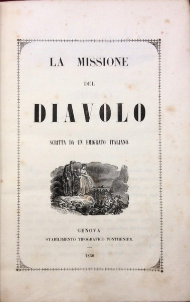 Volume in legatura rigida mezza pelle con piatti cartonati, titolo e fregi oro al dorso, pp 144, con n.6 tavole a piena pagina. Bella incisione al frontespizio, cornici e finalini che adornano il testo. Feroce romanzo anticlericale che attribuisce al Diavolo un'alleanza col Papa e i regnanti impegnati a soffocare i moti rivoluzionari. Il tipografo Ponthenier pubblic˜ alcune opere sui moti rivoluzionari. Testo molto raro. Esemplare molto bello.