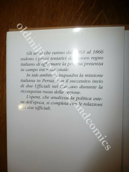 TITOLO: LA MISSIONE MILITARE ITALIANA NEL CAUCASO (1861-1866) LE FONTI ARCHIVISTICHE DELL'UFFICIO STORICO DESCRIZIONE: Stato Maggiore dell'Esercito Ufficio Storico Roma 1997, br. ed. ca. con sovracc. ill. col. con alette, pp. 200 in 8°. Gli anni che vanno dal 1861 al 1866 vedono i primi tentativi del nuovo regno italiano di affermare la propria presenza in campo internazionale. In tale ambito si inquadra la Missione Italiana in Persia con il successivo invio di due Ufficiali nel Caucaso durante la riconquista russa della regione. L’opera che analizza la politica estera dell’epoca si completa con le relazioni dei due Ufficiali. CONDIZIONI: Ottime/Perfette. PESO / WEIGHT: 800 gr. without package