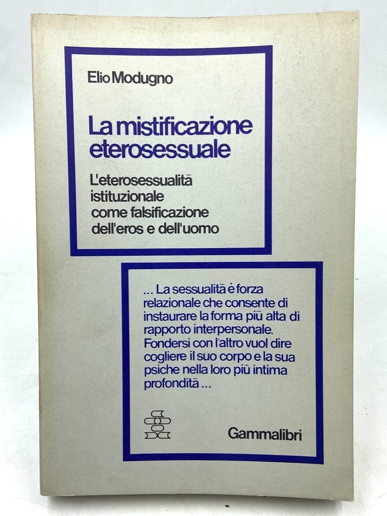 Brossura editoriale a stampa, cm 21 x 14, pp 267 (21), con catalogo editoriale in fine. Ottimo stato. Prima edizione di questo saggio di Elio Modugno, attivista dei movimenti di liberazione omosessuale in Italia, voce laterale e autonoma, fondatore dell’AIRDO e del Collettivo di Liberazione Sessuale di Avanguardia Operaia, attivo nella diffusione dei temi della controcultura omosessuale attraverso canali popolari come una trasmissione su Radio Canale 96 e gli editoriali su «Homo». Questo saggio, che affronta precorrendo molta ricerca socioculturale successiva il tema dell'imposizione dell'eterosessualità normativa, fu pubblicato postumo nel novembre 1978, a due mesi dalla scomparsa di Elio Modugno, cui sono dedicati alcuni versi di Caterina Melloni posti in calce all'opera.