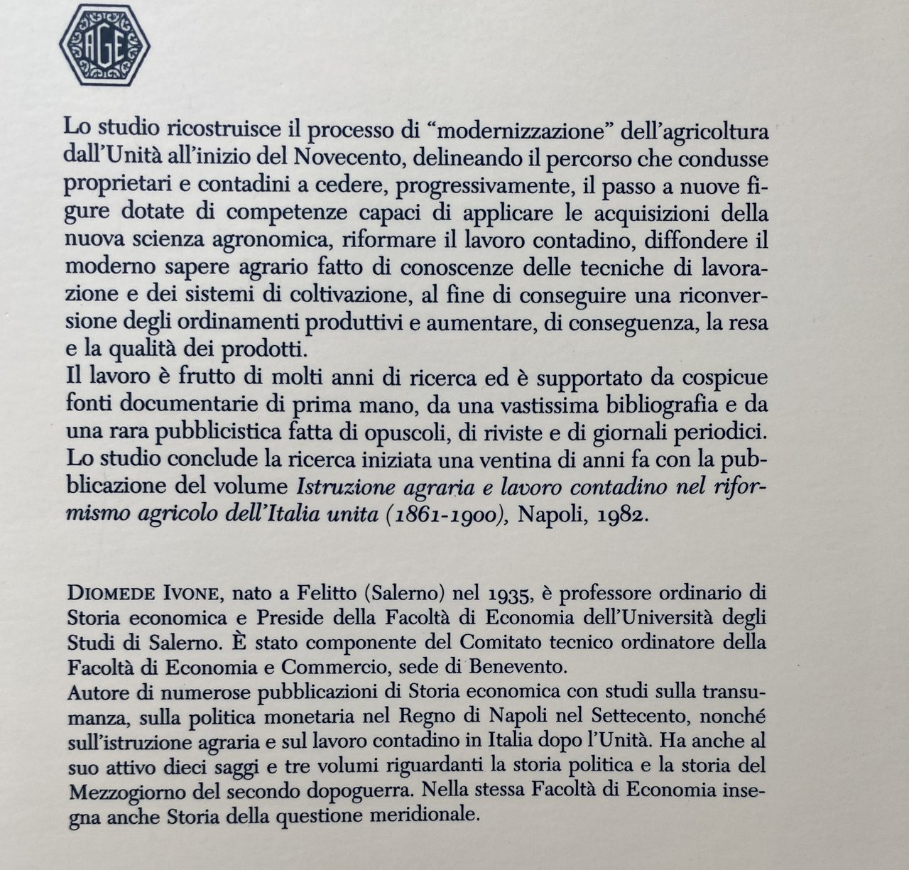 Lo studio ricostruisce il processo di modernizzazione dell'agricoltura dall'Unità all'inizio del Novecento, delineando il percorso che condusse proprietari e contadini a cedere, progressivamente, il passo a nuove figure dotate di competenze capaci di applicare le acquisizioni della nuova scienza agronomica, riformare il lavoro contadino, diffondere il moderno sapere agrario fatto di conoscenze delle tecniche di lavorazione e dei sistemi di coltivazione, al fine di conseguire una riconversione degli ordinamenti produttivi e aumentare, di conseguenza, la resa e la qualità dei prodotti. Il lavoro è frutto di molti anni di ricerca ed è supportato da cospicue fonti documentarie di prima mano, da una vastissima bibliografia e da una rara pubblicistica fatta di opuscoli, di riviste e di giornali periodici. Lo studio conclude la ricerca iniziata una ventina di anni fa con la pubblicazione del volume Istruzione agraria e lavoro contadino nel riformismo agricolo dell'Italia unita (1861-1900), Napoli, 1982.