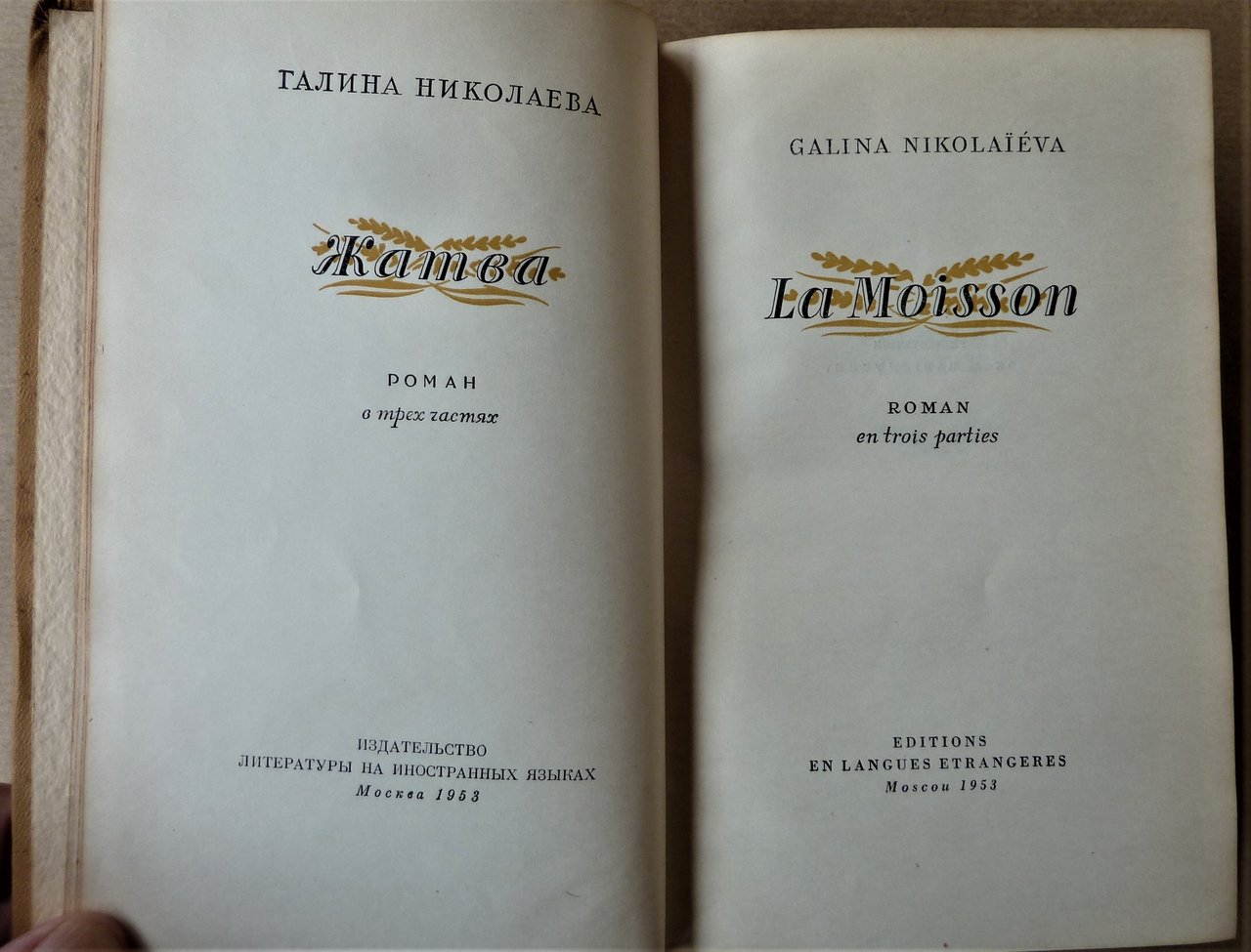 Un fort volume de format in 8° de 680 pp.; reliure de l'éditeur en plein cuir blond crouté; titres dorés ,estampés. Très légèrement manié. Bel état malgré tout. Voir photos. Peu fréquent. Cet ouvrage , "Prix Staline 1950" évoque la remise en route de l'agriculture soviétique après la seconde guerre mondiale. Galina Nicolaïeva, auteur de grand talent, resta dans l'orbite du réalisme socialiste soviétique.