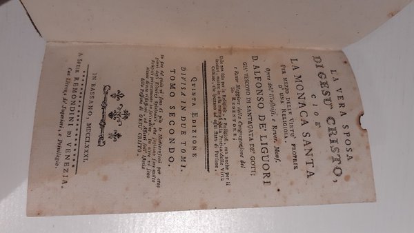 Volume "La monaca santa" in buone condizioni di Alfonso de'Liguori del 1781, edito da Remondini di Venezia. Pag. 382