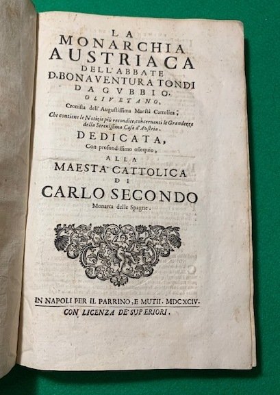 In 4° (31x19,5 cm); (4), 198 (i. e. 298) pp. e una c. di tav. Bellissima legatura coeva i n piena pergamena molle con titolo chiosato da elegante grafia coeva lungo tutta la lunghezza del dorso. Qualche pagina uniformemente e leggermente brunita a causa della qualità della carta e nel complesso esemplare in ottime condizioni di conservazione. La maggior parte degli esemplari si presenta senza alcuna tavola fuori testo, qualche esemplare presenta 3 tavole fuori testo (un antiporta, un ritratto ed una tavola genealogica), il nostro una sola tavola con il ritratto dell'Imperatore Carlo II di Spagna e chiaramente, nel nostro esemplare, altre tavole non sono mai state aggiunte o tolte da esso. Prima edizione anche se esistono esemplari con la data del 1691 con un numero di tavole variabili da 2 a una, di questa celebre opera storica dedicata alla monarchia Austriaca, opera del noto abate olivetano, appartenente alla comunità ermetica senese di Monte Oliveto Maggiore, Bonaventura Tondi. Esemplare in buone-ottime condizioni di conservazione ed in bella legatura coeva.