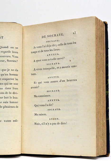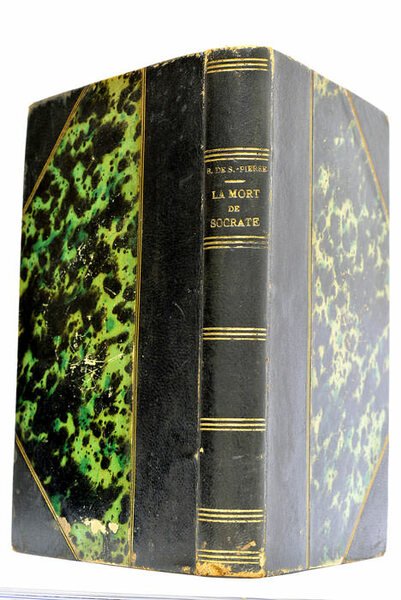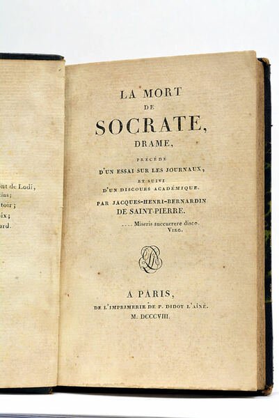 XL. 191 pages. (14x9 Cm). Demi-veau bleu à coins. Dos lisse orné de filets dorés. Reliure de l’époque. Coins et coiffes émoussés. Plats un peu frottés. Rousseurs éparses. Papier bruni. Edition Originale de la seule pièce de théâtre composée par l’auteur de ‘Paul et Virginie’. Ce drame dont plusieurs scènes étaient parues précédemment dans un périodique, met en scène les derniers instants de Socrate afin de montrer “que la philosophie n’a pas manqué de persécuteurs dans les pays et les temps les plus éclairés”. Exemplaire en bon état.