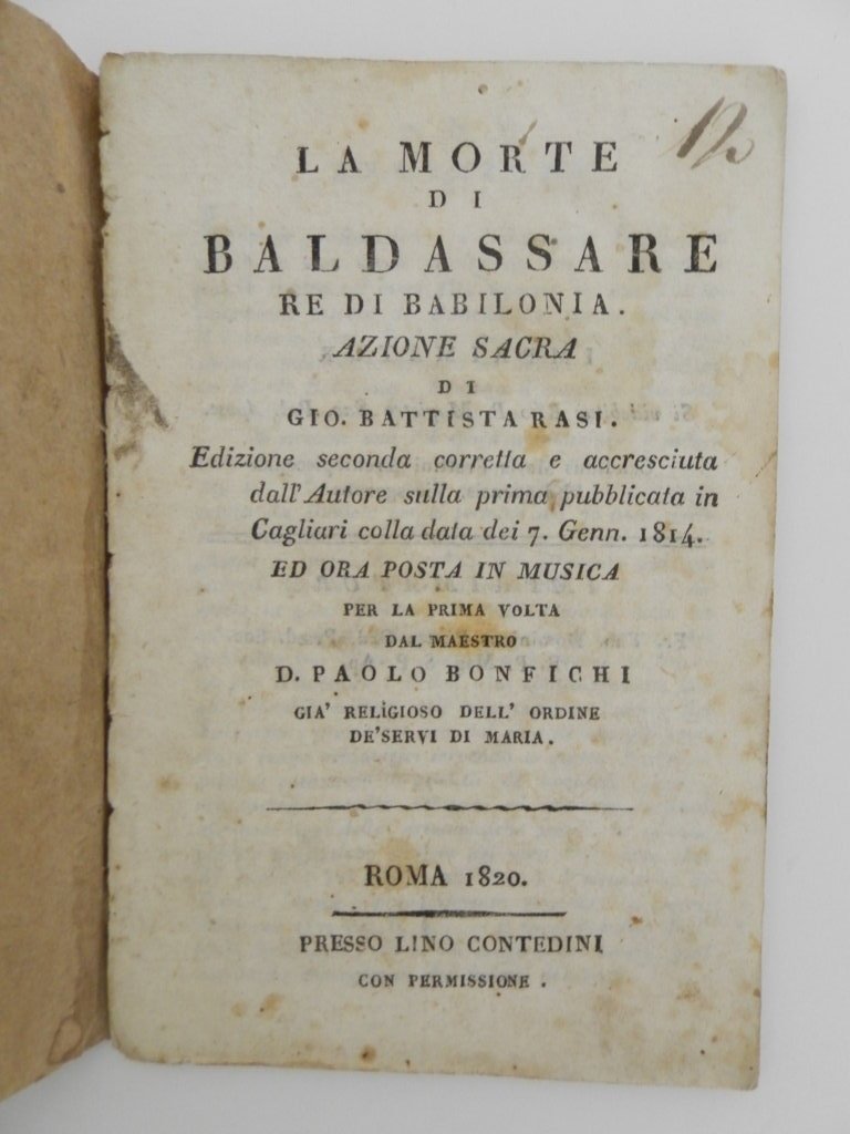 24^, pp. 32, brossura cartacea coeva con macchie ai piatti, piccole arrossature al frontespizio, altrimenti buona copia. Trattasi della edizione seconda corretta e accresciuta dall'Autore sulla prima pubblicata in Cagliari colla data dei 7. Genn. 1814. Ed ora posta in musica per la prima volta dal maestro Paolo Bonfichi. Certamente non comune. . *** TUTTI I NOSTRI LIBRI SONO VISIBILI PREVIO CONTATTO MAIL O TELEFONO NELLA NUOVA SEDE DI MILANO: LIBRERIA COSMOPOLIS, VIA JOMMELLI, 22. ***
