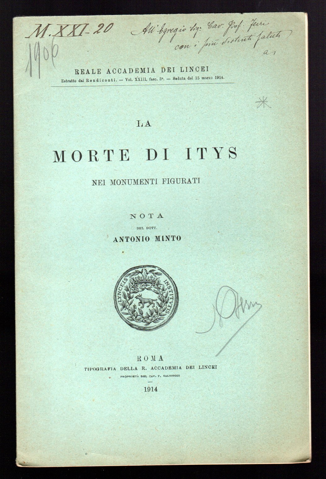 Opuscolo vintage.Estratto dai Rendiconti. Vol. XXIII, fasc. 3°. - Seduta del 15 marzo 1914. Dedica autografa dell'autore. Illustrazioni in bn all'interno del testo. Segni di matita in copertina. Usura da scaffale. Ordinario segno del tempo.
