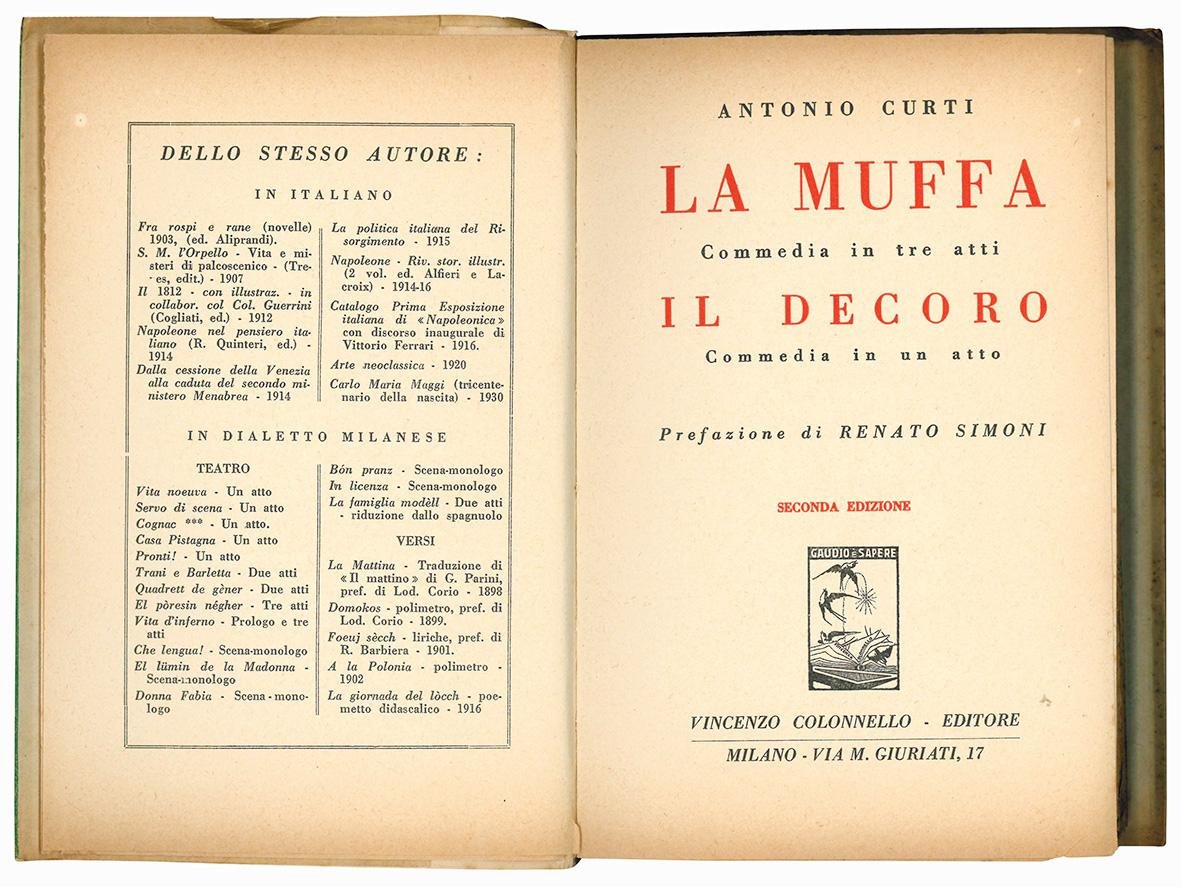 La muffa. Commedia in tre atti. Il decoro. Commedia in un atto. Prefazione di Renato Simoni. Seconda edizione.