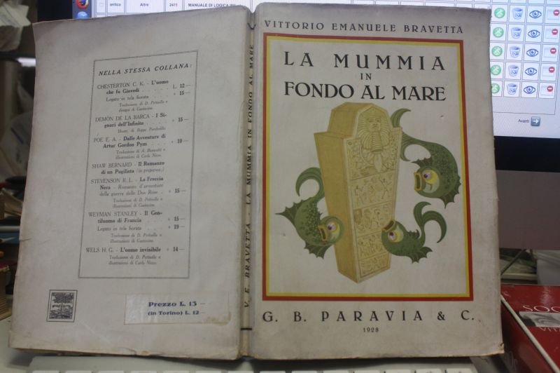 Codice 2416, , LA MUMMIA IN FONDO AL MARE di V. E. BRAVETTA ill. P. BOLOGNA, , Spesso vol. in-8° grande (cm. 23,8x16,2), pp. 328 + 9 delicate elaborate TAVOLE b.n. f.t. della raffinata Paola BOLOGNA. Meritò una riediz. nel 1963. Bross. edit. con ombre e tracce di polvere alla pur raffinata cop. ill. a colori (strani pesci verdi-gialli e sarcofago). Bello, avventuroso e raro