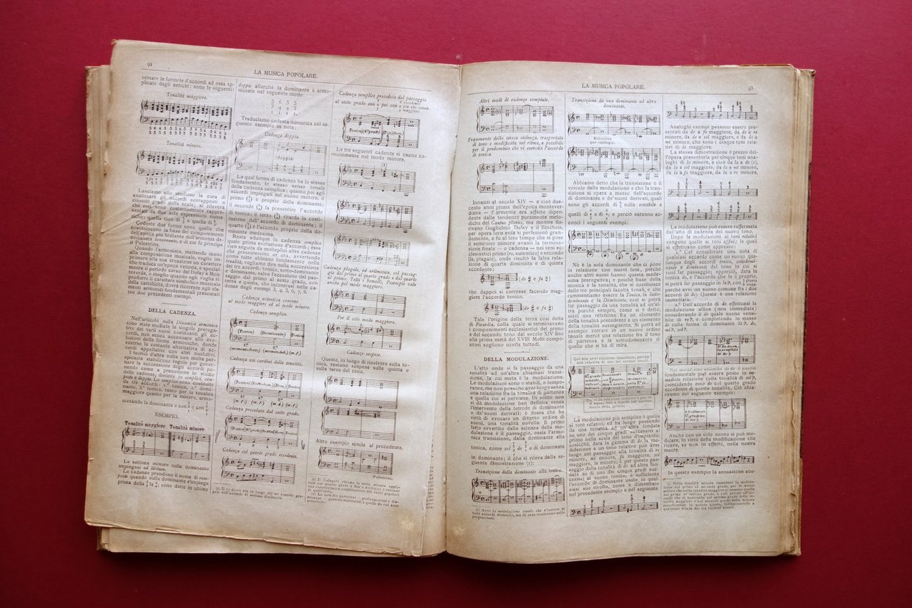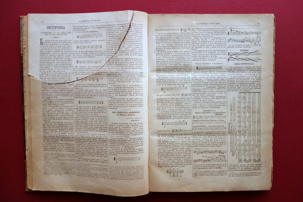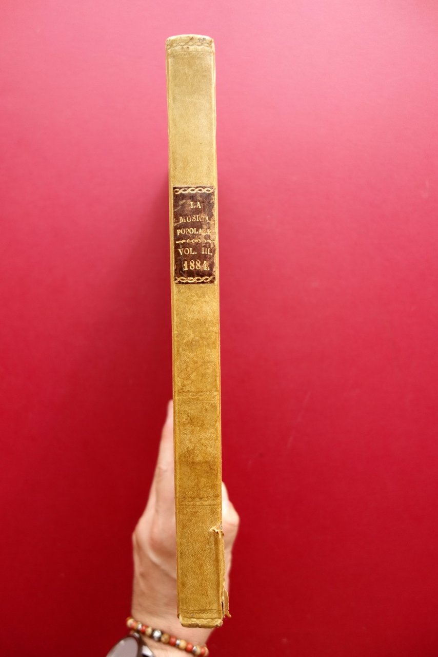 AA. VV., La Musica Popolare" giornale mensile illustrato di testo, musica e disegni volume III - 1884 - 12 fascicoli - annata completa Sonzogno, Milano 1884; cm 30,5x21,5; pp. 192-VI complessive con alcune ill. in b/n nel t. e brevi sezioni di partiture; ciascun fascicolo presenta, al termine del testo, una partitura musicale di pp. 8. Legatura d'epoca in mezza pergamena (dorso e angoli) con titolo impresso in oro entro tassello al dorso, piatti marmorizzati. Raccolta di 12 fascicoli completi, corrispondenti all'annata completa del 1884, rilegati in un unico volume. Ciascun fascicolo presenta le brossure ed. originali. Condizioni di conservazione Condizioni complessivamente buone con leggere tracce d'uso, piatti con alcune minime abrasioni e graffietti, piccole mancanze ai margini; cuffia inf. con taglietto di alcuni cm in corrispondenza della cerniera Interni buoni con poche minime bruniture, lievemente ingialliti ai margini a causa della tipologia di carta; pp. 3-14 e pp. 85-92 con leggero allentamento delle cuciture (esemplare peraltro compatto); pp. 27-28 con distacco dell'angolo superiore destro, da restaurare; nessuna perdita di testo, che rimane perfettamente leggibile (vedi foto). Pagina 4 della partitura del fascicolo numero 8 con una circoscritta mancanza all'angolo inferiore destro (vedi toto). Margine destro delle pp. V-VI con una piccola mancanza. Edizione "di lusso", che "esce il 15 d'ogni mese per dispense di venti pagine di testo e disegni, oltre ad otto pagine di musica." Raccolta di 12 fascicoli completi, rilegati in un unico volume, corrispondenti all'intera annata 1884. Tutti i fascicoli sono corredati della brossura editoriale originale. Qualche difetto come in foto e in descrizione, ma raccolta complessivamente in buono stato. SETT228.L24078 N "