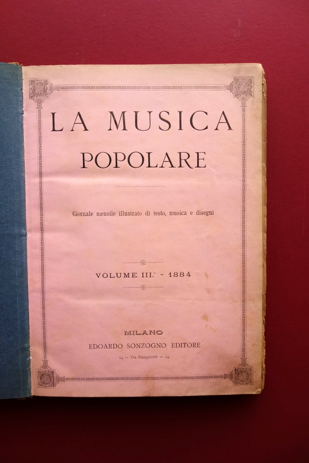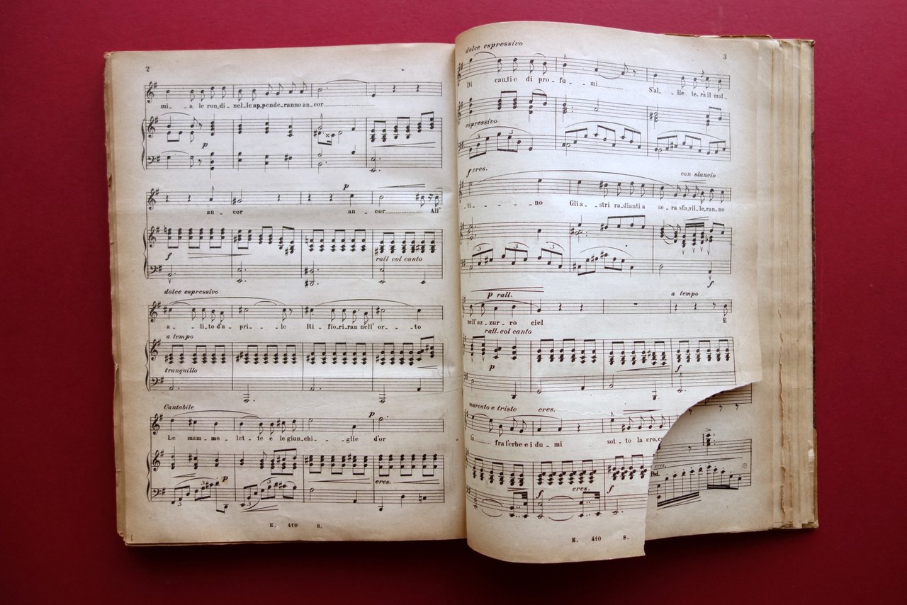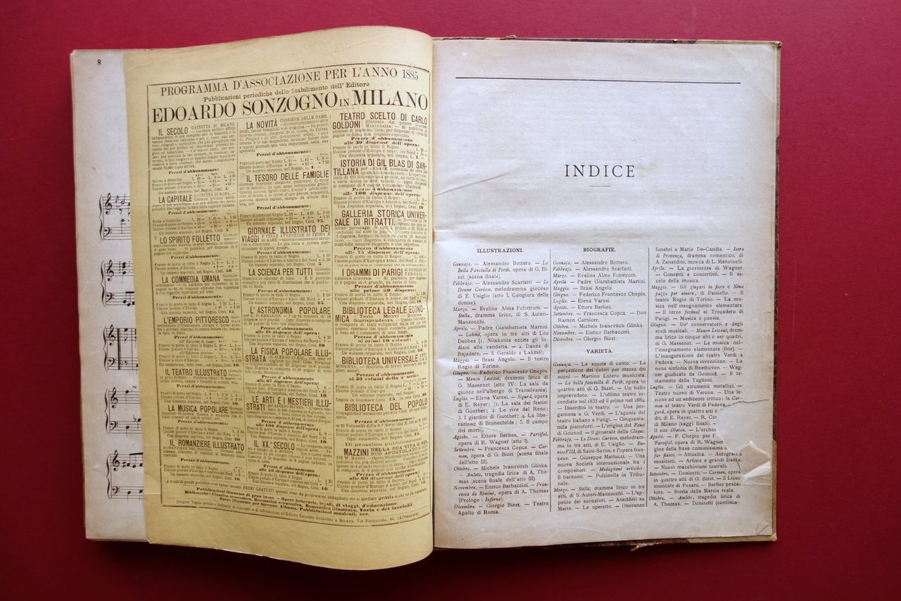 AA. VV., La Musica Popolare" giornale mensile illustrato di testo, musica e disegni volume III - 1884 - 12 fascicoli - annata completa Sonzogno, Milano 1884; cm 30,5x21,5; pp. 192-VI complessive con alcune ill. in b/n nel t. e brevi sezioni di partiture; ciascun fascicolo presenta, al termine del testo, una partitura musicale di pp. 8. Legatura d'epoca in mezza pergamena (dorso e angoli) con titolo impresso in oro entro tassello al dorso, piatti marmorizzati. Raccolta di 12 fascicoli completi, corrispondenti all'annata completa del 1884, rilegati in un unico volume. Ciascun fascicolo presenta le brossure ed. originali. Condizioni di conservazione Condizioni complessivamente buone con leggere tracce d'uso, piatti con alcune minime abrasioni e graffietti, piccole mancanze ai margini; cuffia inf. con taglietto di alcuni cm in corrispondenza della cerniera Interni buoni con poche minime bruniture, lievemente ingialliti ai margini a causa della tipologia di carta; pp. 3-14 e pp. 85-92 con leggero allentamento delle cuciture (esemplare peraltro compatto); pp. 27-28 con distacco dell'angolo superiore destro, da restaurare; nessuna perdita di testo, che rimane perfettamente leggibile (vedi foto). Pagina 4 della partitura del fascicolo numero 8 con una circoscritta mancanza all'angolo inferiore destro (vedi toto). Margine destro delle pp. V-VI con una piccola mancanza. Edizione "di lusso", che "esce il 15 d'ogni mese per dispense di venti pagine di testo e disegni, oltre ad otto pagine di musica." Raccolta di 12 fascicoli completi, rilegati in un unico volume, corrispondenti all'intera annata 1884. Tutti i fascicoli sono corredati della brossura editoriale originale. Qualche difetto come in foto e in descrizione, ma raccolta complessivamente in buono stato. SETT228.L24078 N "