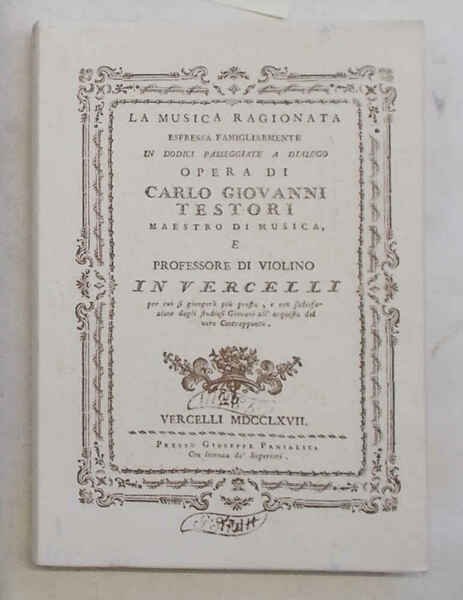 In 8° (cm. 23 x 16); pagg. (8), CLI, 21 (di spartiti musicali), 2; leggera carton. originale con sovracop. VG. ** "Opera di Carlo Giovanni Testori Maestro di Musica e Professore di Violino in Vercelli per cui si giungerà più presto, e con soddisfazione degli studiosi giovani all'acquisto del vero Contrappunto".