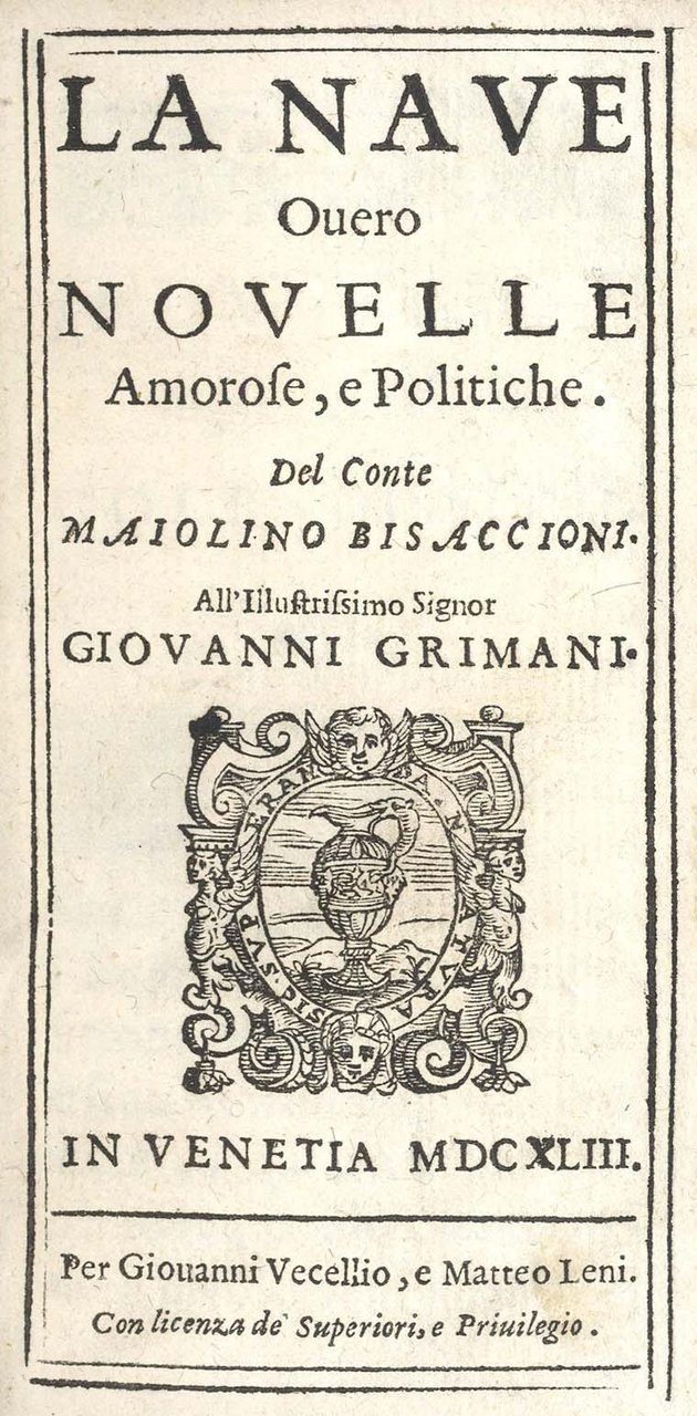 >in-12, (145x73 mm), pp. 432 (compreso occhietto e frontespizio), legatura coeva in pergamena floscia. Titolo entro duplice filetto xilogr. e con impresa editoriale, inziali xilogr. e finalini; precede il testo dedica al Grimani. Concepito come prosecuzione de "l'Albergo" del medesimo autore, questo volume comprende 12 novelle, precedute ognuna dal proprio argomento. Nello stesso anno apparve una seconda parte dell'opera composta da 12 ulteriori novelle e dedicata a Nicolò Bragadin. La "Nave" fa parte di una quadrilogia (1637 - 1664, con l'"Albergo" appunto, "L'Isola"e "Il Porto") di complessive 62 novelle "tutte piene di suicidi, omicidi, tradimenti, adulteri,..." (Cat. Vinciana 3187). Lo spunto narrativo, narrato dall'Autore nell'Introduzione, è che trovandosi a viaggiar per nave, propose ai gentiluomini che viaggiavano con lui di allietare il viaggio con dei racconti, tra il picaresco e il libertino, che egli trascrisse. Ottimo esemplare della sola prima parte. Passano I 52. Cat. Vinciana 3188. Gamba, Novelle, 173.