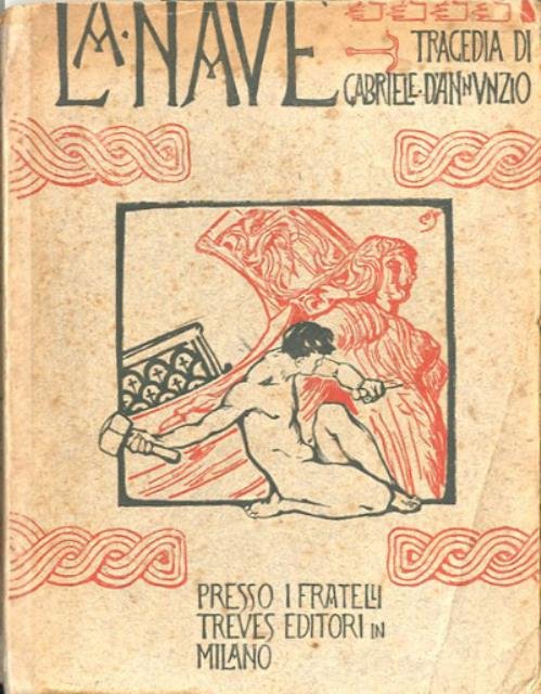 249 p. : ill. ; 23 x 17 cm. Le tematiche superumane sono al centro de La nave, tragedia in versi del 1907 che ricostruisce fantasiosamente episodi di una storia lontana. Il condottiero protagonista del dramma si accampa con il suo eroismo trionfante all’interno di uno scenario grandioso e suggestivo rappresentato dalla Venezia delle origini. L’opera, ricca di allusioni politiche, riscosse un particolare successo in occasione della sua prima rappresentazione l’11 gennaio del 1908. Disegni e fregi in xilografia di Duilio Cambellotti. Brossura editoriale, coperta illustrata a colori in cartoncino flessibile. Segni del tempo alla coperta, dorso riparato con ns. ad. inv., copertina, taglio, risvolti bruniti con fioriture e carta interna ingiallita. Codice libreria 4865.