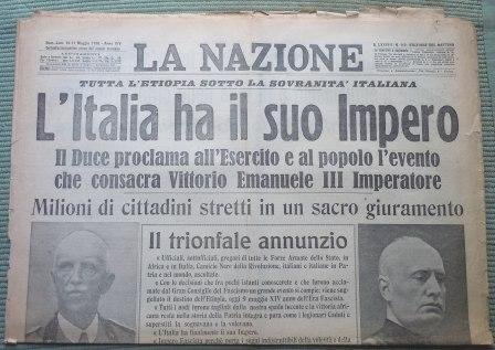 In folio, cm 58, pp. 8. In prima pagina: Tutta l'Etiopia sotto la sovranità italiana. L'Italia ha il suo Impero. In ultima, a piena pagina, carta geografica dell'impero italiano d'Etiopia. Piega centrale.