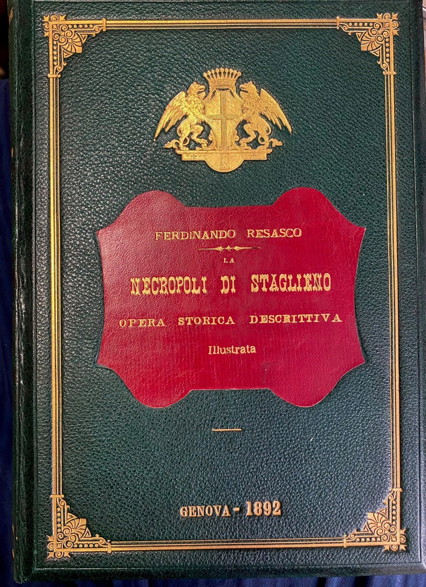 Vol. unico- formato in 8°-leg. in piena pelle verde arricchita da fregi dorati-stemma della città di Genova al piatto ant. e tassello in pelle rossa con titolo -ritratto in litografia dell'autore in antiporta- timbro di precedente proprietario sul frontespizio-352 pagine - LX ill. +VI+1- leggera brunitura alle risguardie -completo ed in ottimo stato di conservazione.