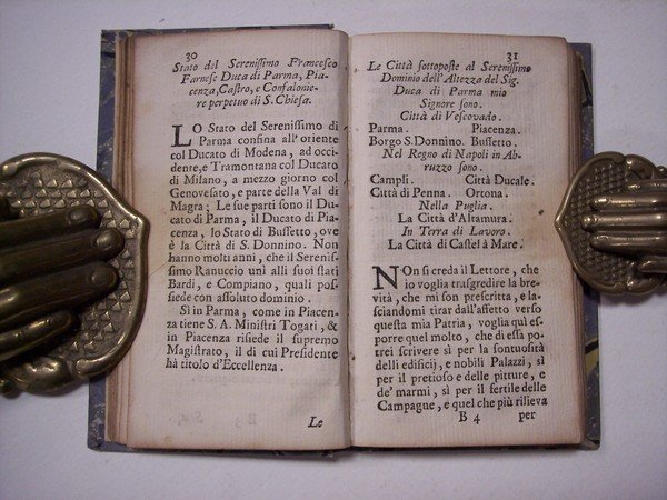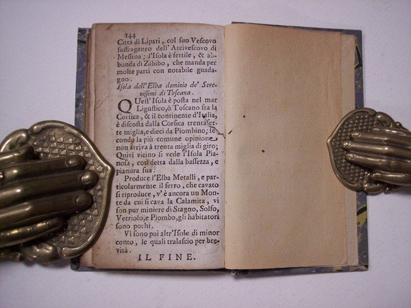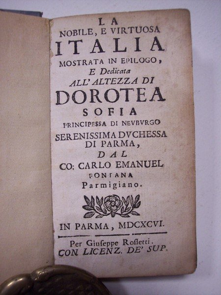 Cm. 13 x 7; pp. 144; legatura posteriore in cartone marmorizzato (margini un po' stretti).<BR>CONDIZIONI BUONE (consueta la diffusa brunitura della carta).<BR>Carlo Emanuele Fontana (Parma, 1678 - Renania, 1730) fu paggio alla corte dell'imperatrice Eleonora e poi a quella di Ranuccio Farnese. Collaborò ad opere letterarie e in seguito "viaggiò per le principali città d'Italia e raccolse materiale che nel 1696 pubblicò in un'operetta curiosa e importante, dedicata a Dorotea Sofia di Neuburg, intitolata "La nobile, e virtuosa Italia mostrata in epilogo", stampata da Giuseppe Rossetti, nella quale descrive tutti gli Stati italiani, con particolare cura per gli istituti di educazione. Molto interessante è la descrizione del Collegio dei Nobili di Parma". Il Fontana fu poi anche Cameriere della chiave d'oro dell'elettore palatino Carlo Filippo in Renania. (LASAGNI, Dizionario biografico dei parmigiani, Parma, PPS, 1999)