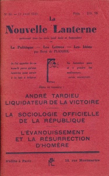 1930 1930 1930. In-12 agrafé. André Tardieu liquidateur de la victoire. La sociologie officielle de la République. L'évanouissement et la résurection d'Homère. Bon état