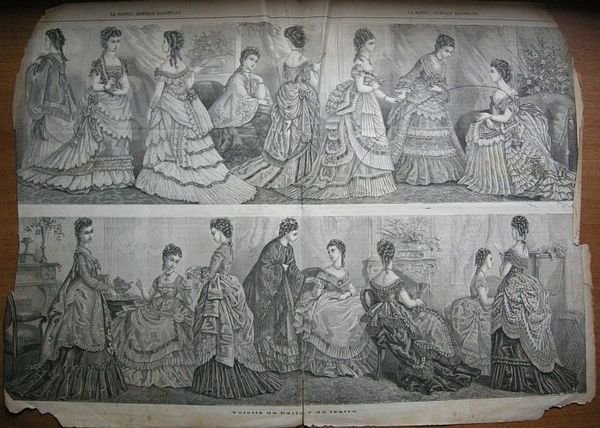 In 4? (cm 38,5), senza rilegatura, pagg.4 (da pag. 1 a pag. 8) con diverse ill.b.n. n.t. (relative ad abbigliamento ed accessori da donna; modelli per lavori di ricamo), bella ill. b.n. a doppia pag. "Toelette da ballo e da teatro" rarissime lievi fioriture, strappetti e mancanze ai margini che interessano marginalmente anche il testo e le ill., qualche segno a matita bl? all'ill. a doppia pag. e a una carta interna, peraltro buon es.