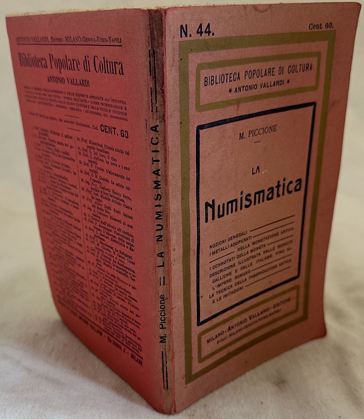 Edizione del 1914 di questo volume di numismatica scritto da Piccione della collana "Biblioteca popolare". All'interno: I metalli (oro, argento, rame), Connotati della moneta, Gallia (Aquitania, Narbonese, Allobrogi, Lugdunensi, Belgica); Italia (Etruria, Umbria, Piceno, Lazio, Sannio, Frentani, Monete della guerra civile, Campania, Apulia, Calabria, Lucania, Bruttii, Sicilia, Re di Sicilia, Isole Siciliane, Impero Romano); La fabbricazione e le imitazioni. In buone condizioni. Copertina editoriale in buone condizioni con lievi usure marginali. Legatura in buone condizioni. All'interno le pagine si presentano in buone condizioni con rare fioriture. In 8. Dim. 19x12 cm. Pp. 128+(8). Edition of 1914 of this volume of numismatics written by Piccione of the series "Biblioteca popolare". Inside: metals (gold, silver, copper), Carachetristics of coins, Gallia (Aquitania, Narbonese, Allobrogi, Lugdunensi, Belgica); Italy (Etruria, Umbria, Piceno, Lazio, Sannio, Frentani, Monete della guerra civile, Campania, Apulia, Calabria, Lucania, Bruttii, Sicilia, Re di Sicilia, Isole Siciliane, Impero Romano); Fabbrication and imitation. In good conditions. Editorial cover in good conditions lightly worn in the extremities. Binding in good conditions. Pages in good conditions with occasional foxing. In 8. Dim. 19x12 cm. Pp. 128+(8). <BR><BR>