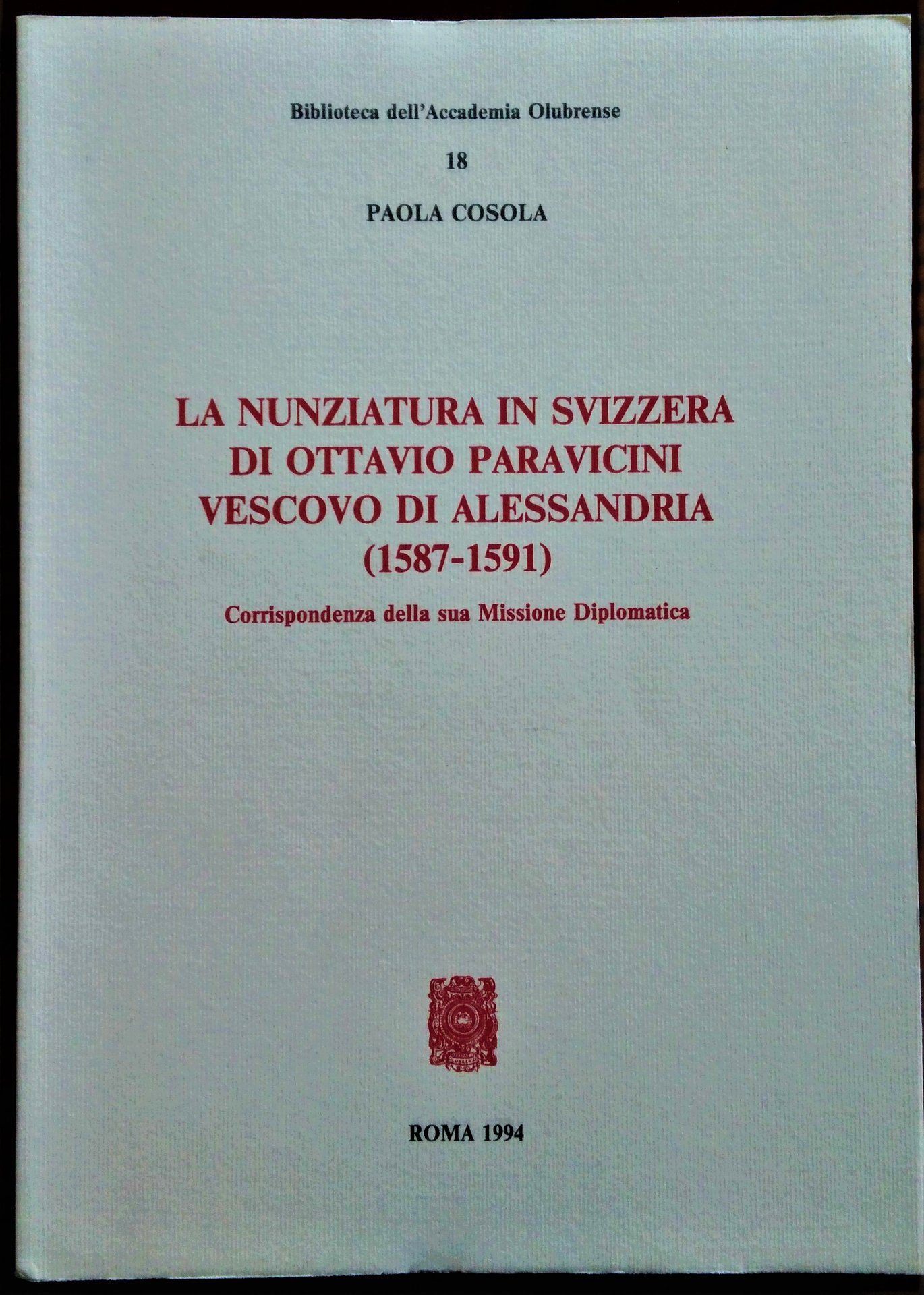 La Nunziatura in Svizzera di Ottavio Paravicini Vescovo di Alessandria (1587-1591). Corrispondenza della sua Missione Diplomatica.
