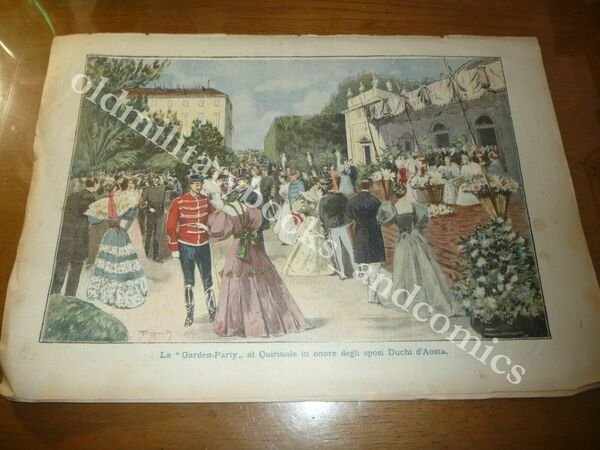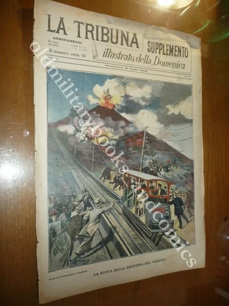 "DESCRIZIONE: La Tribuna Supplemento Illustrato della Domenica, Roma, Anno III n. 29 (21 Luglio 1893). COPERTINA: La nuova bocca eruttiva del Vesuvio (ill. Romagnoli) RETRO: La "Graden Party" al Quirinale in onore degli sposi Duchi d'Aosta (ill. Zaniboni) La Tribuna illustrata fu un settimanale italiano pubblicato a Roma. Fondato nel 1890 come supplemento del quotidiano La Tribuna, il primo numero uscì il 6 gennaio. Il formato della rivista era 27x38 cm e ogni numero conteneva 16 pagine. In breve tempo divenne il primo settimanale illustrato italiano. Nella prima metà del XX secolo, rivaleggia con il settimanale del Corriere della Sera, La Domenica del Corriere. CONDIZIONI: Buone pieghe alla parte alta della rivista. Non spillato proveniente da rilegatura. PESO / WEIGHT: 150 gr. without package"