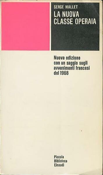 Nuova edizione, rist. 236 p. ; 18 x 11 cm. Piccola biblioteca Einaudi, 144. Alla luce degli avvenimenti del maggio '68, Serge Mallet propone una nuova edizione di questa sua inchiesta sociologica sulla classe operaia nel Secondo Novecento. Titolo originario dell'opera: «La nouvelle classe ouvriere». Traduzione di Goffredo Fofi. Brossura editoriale, coperta in cartoncino flessibile colorato (b/n, rosa), titolo impresso al piatto e al dorso. Codice libreria 7554.
