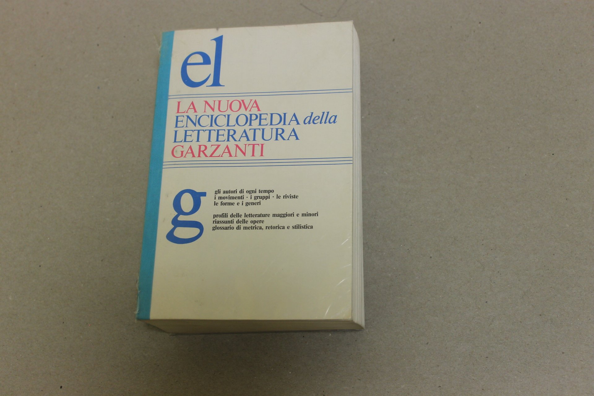 AA.VV. La nuova enciclopedia della letteratura Garzanti. Milano, Garzanti 1991 italiano, 19 12,5 pp. 1294 Gli autori di ogni tempo - i movimenti - i gruppi - le riviste, le forme e i generi. Profili delle letterature maggiori e minori - riassunti delle opere - glossario di metrica, retorica e stilistica.