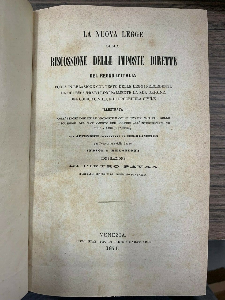Posta in relazione col testo delle leggi precedenti da cui essa trae principalmente la sua orgine del codice civile e dei procedura civile illustrata coll'esposizione delle proposte e col sunto dei motivi e delle discussioni del parlamento per servire all'interpretazione della legge stessa. Con appendice contenente in regolamento per l'esecuzione della legge indici e relazioni. Venezia. Naratovice 1871, 8°, pp. XVI+328+XXVIII. Leg. mz pelle, tit. in oro al dorso.