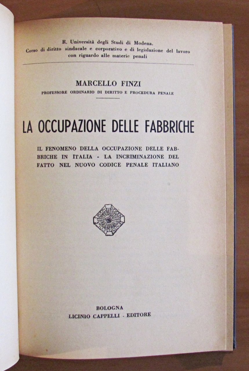 Il fenomeno della occupazione delle fabbriche in Italia - La incriminazione del fatto nel nuovo codice penale italiano. Cappelli Editore - Bologna, I edizione 1935. Tela editoriale con vecchia firma di appartenenza in antiporta. 14x20; pp.183. RARO. STATO di NUOVO , Perfetto (Mint)
