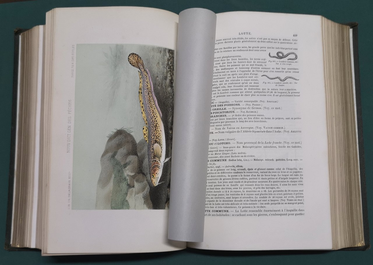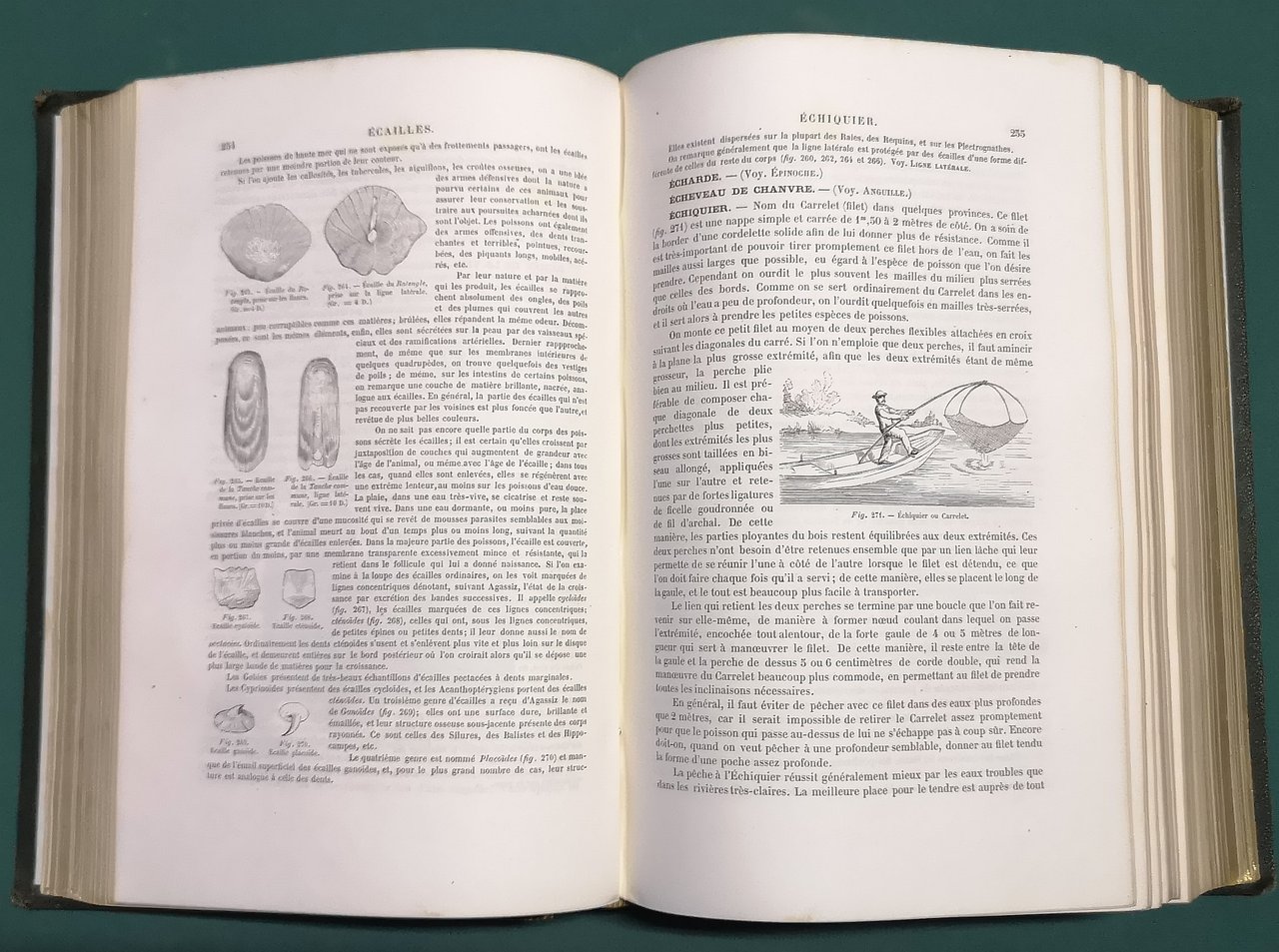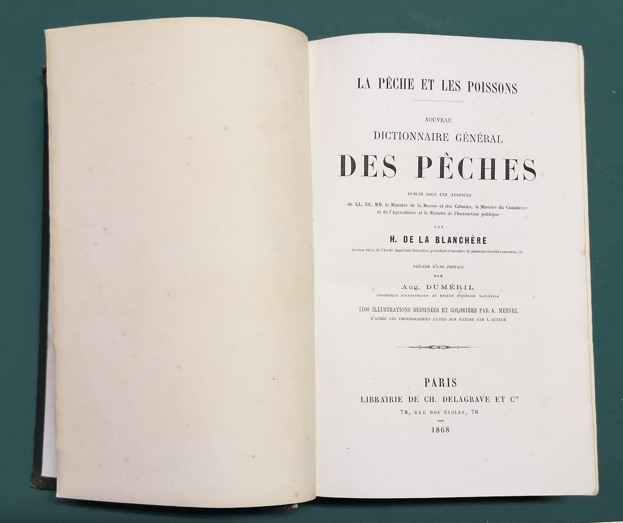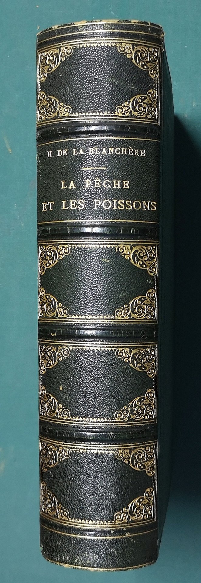 >in-4, pp. XV, (1), 859, superbamente illustrate da 1110 illustrazioni nel testo in silografie e 50 tavole litografiche a colori protette da velina. Legatura coeva in mezza pelle verde, titolo e fregi in oro su dorso a nervi, tagli dorati. Edizione originale di questa vasta opera dedicata alla pesca. Ottimo esemplare (lievissimi difetti al dorso, piccole arrossature).