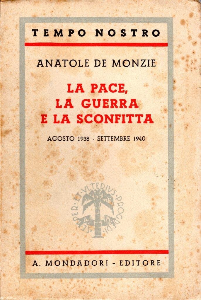 La pace, la guerra e la sconfitta, prima edizione ottobre 1941, pp. 291, formato 13 x 19,5. <BR>Copertina morbida di colore beige con titoli in nero e rosso al piatto anteriore e in nero sul dorso. Titolo dell'opera originale: "Ci-Devant". Traduzione di Cesare Giardini. <BR>Evidenti fioriture ai piatti, altrimenti in ottime condizioni. <BR>