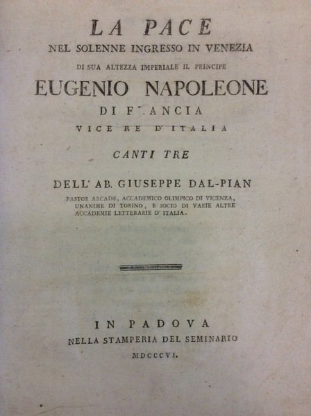 In-4 p. (mm. 293x220), brossura moderna marmorizzata, pp. 55. Canti tre dell'Ab. Giuseppe Dal-Pian, Pastor Arcade, Accademico Olimpico di Vicenza, Unanime di Torino, e Socio di varie altre Accademie Letterarie d'Italia. Celebrazione in versi dell'ingresso in Venezia di Eugène de Beauharnais, nominato viceré d'Italia nel 1805, e che fu il più leale dei luogotenenti dell'imperatore Napoleone. "Edizione originale".Fresco esemplare marginoso, ben conservato.