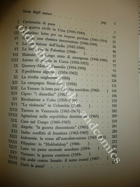 DESCRIZIONE: Rizzoli Ed. Milano 1971, br. ed. ca. con sovracc. ill. col. con alette, pp. 347 alcune ill. b/n f.t. in 8°. I due A. sono marito e moglie, nonchè corrispondenti di guerra dei giornali Life e Time. Le guerre da loro descritte vanno dal periodo 1945 - 1967. Guerre in Cina India, Palestina, Congo, Vietnam, Indocina, Venezuela, Colombia, Cuba etc. CONDIZIONI: Ottime/Perfette. PESO / WEIGHT: 750 gr. without package